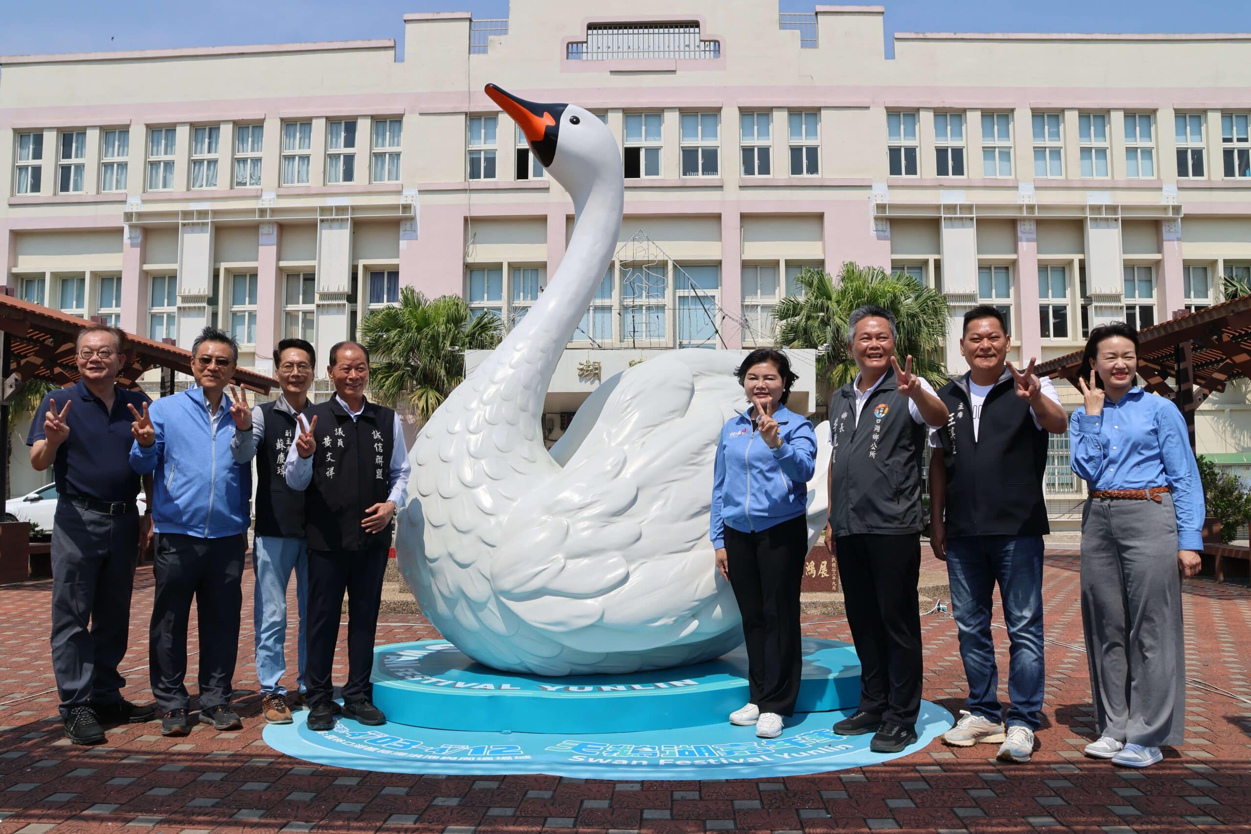 為迎接即將登場的「雲林天鵝湖嘉年華」,3米高天鵝裝置藝術於31日下午於口湖鄉公所前廣場提前曝光,純白優雅的造型一亮相即吸引民眾駐足拍照,成為在地最新打卡亮點,縣長張麗善、副縣長謝淑亞、農業處長魏勝德、議員黃文祥、口湖鄉長李龍飛、鄉代會主席王溪邊、中華民國養鵝協會理事長蔡瑞堂、口湖鄉農會總幹事呂惠玲等一同邀請全國民眾 4月3-12日至雲林口湖椬梧滯洪池一睹8米高巨型天鵝的萌樣。