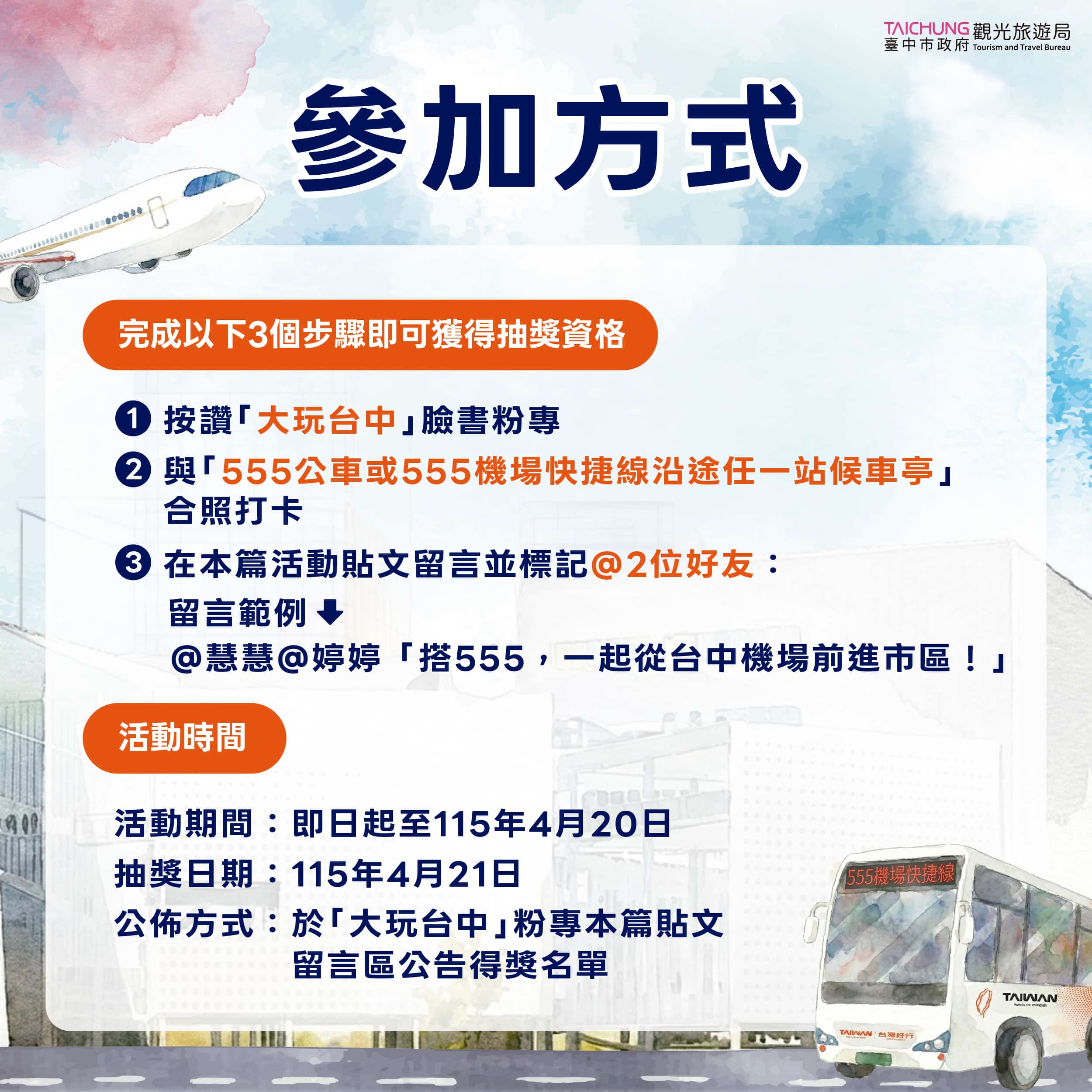 觀旅局表示,即日起至4月20日「大玩台中」Facebook粉絲專頁辦理線上抽獎活動,民眾只要至粉專按讚,並與「台灣好行-555機場快捷線」公車或沿線任一站候車亭合照打卡,並於活動貼文標記好友及留言,即可參加抽獎,4月底將抽出幸運得主,送出澳門航空「台中-澳門」來回機票。