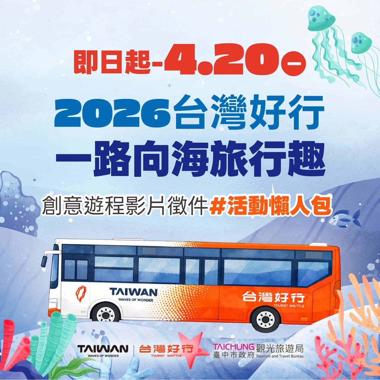 此外,還有「2026台灣好行 一路向海旅行趣」創意遊程影片徵件活動,邀請民眾搭乘「台灣好行-679台中活力海洋線」,以短影音形式記錄高美濕地、台中海洋館、梧棲漁港、大甲鎮瀾宮等海線景點風光與人文故事。活動最高獎金2萬元,徵件至4月20日止,歡迎各年齡層及國內外旅客踴躍參加。