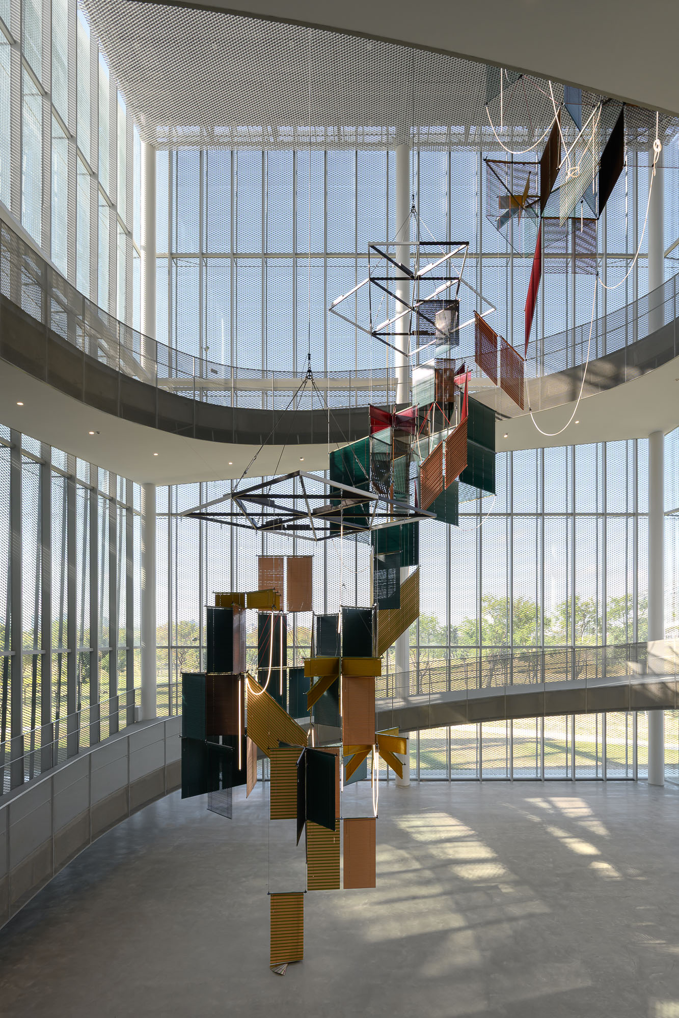 美術館大廳委託創作計畫仍免費參觀。作品為梁慧圭 ( Haegue Yang ),〈流動奉獻-樹蔭三合〉,2025