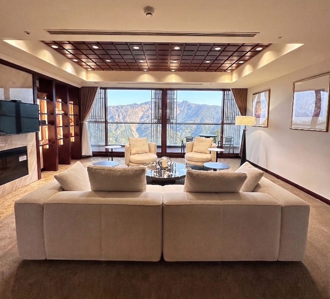 48坪「首席套房」讓旅人欣賞世界級的高山景觀,開闊無遮蔽的壯麗景色成為客房內的絕佳景致。起居空間,寬敞舒適與無敵山景視野,迎來大塔山的雄偉壯麗與眠月線的遺世獨立感,如詩如畫如置身仙境般;景觀客廳寬敞舒適的空間,搭配大片落地窗引入大量自然光線,雲霧繚繞其間,如山嵐輕拂。