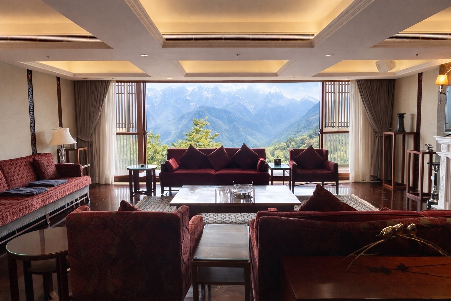 60坪「尊爵套房」帶領旅人穿梭山岳、雲瀑的極致體驗。180度無遮蔽遼闊視野,坐擁鄒族大塔山、眠月線步道第一排景觀絕佳視野,遠眺玉山山脈及連綿壯麗的山景,以山巒雲霧、靜謐與尊榮,為旅人開啟一段遠離塵囂的非凡旅程!客房空間搭配雙面大面積落地窗,180度的寬闊視野襯映窗外大塔山的雄偉壯麗,自在優雅的隱逸於高山謐靜之中。柔軟床寢讓身心自在伸展,承載一夜安穩好眠。特別一提的是,景觀客廳沙發設計,巧妙揉和典雅木質元素與〈勃根地酒紅〉色調,營造出最適合高山綠意的一抹紅彩,古典與現代感交織的設計,充分展現阿里山賓館百年風華,雅致又不失時尚,細膩鋪陳出溫潤的旅居氛圍。