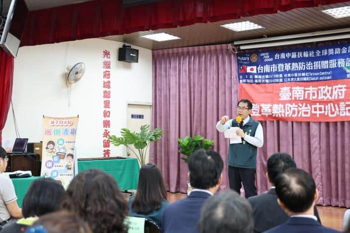 台南市政府為因應氣候變遷帶來的登革熱疫情挑戰,持續強化公私協力防疫網絡。今(2)日於東區德光里活動中心舉辦「登革熱防治捐贈服務計畫」記者會,由市長黃偉哲頒發感謝狀,感謝台南中區扶輪社及國際扶輪社慨捐新台幣94萬1,000元,並期盼透過民間資源的挹注,全面提升大台南的登革熱防護網。