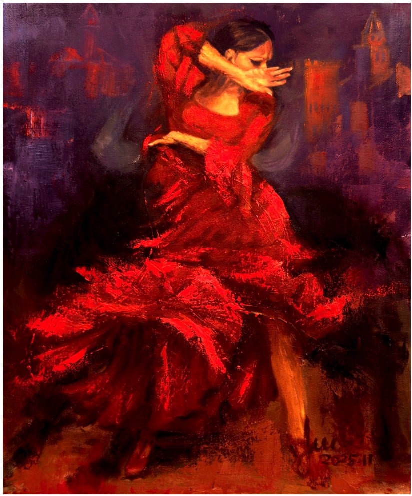 在此次展出的「第二樂章」系列中,她以台灣民謠為靈感,透過色塊的呼吸感與留白的節奏,創作出《春風凝望》、《雨夜花吟》、《聖母峰月夜》等作品。其中指標性創作《四季丹色》,以厚實紅色肌理堆疊四季流轉意象,象徵基業長青,於展覽期間即獲企業界人士以六位數中段價格典藏,顯示其作品已逐步建立市場辨識度與收藏價值。除了畫樂融合系列外,段逸君以畫刀技法呈現的人物、花鳥與旅行主題作品同樣備受矚目。作品《西班牙印象》以佛朗明哥舞者的動態為視覺核心,融合鬥牛文化的張力與阿罕布拉宮的歷史殘影,在文化符碼與藝術表現之間取得巧妙平衡,展期間引發多組藏家積極詢問,最終於近乎競逐的情況下完成收藏。