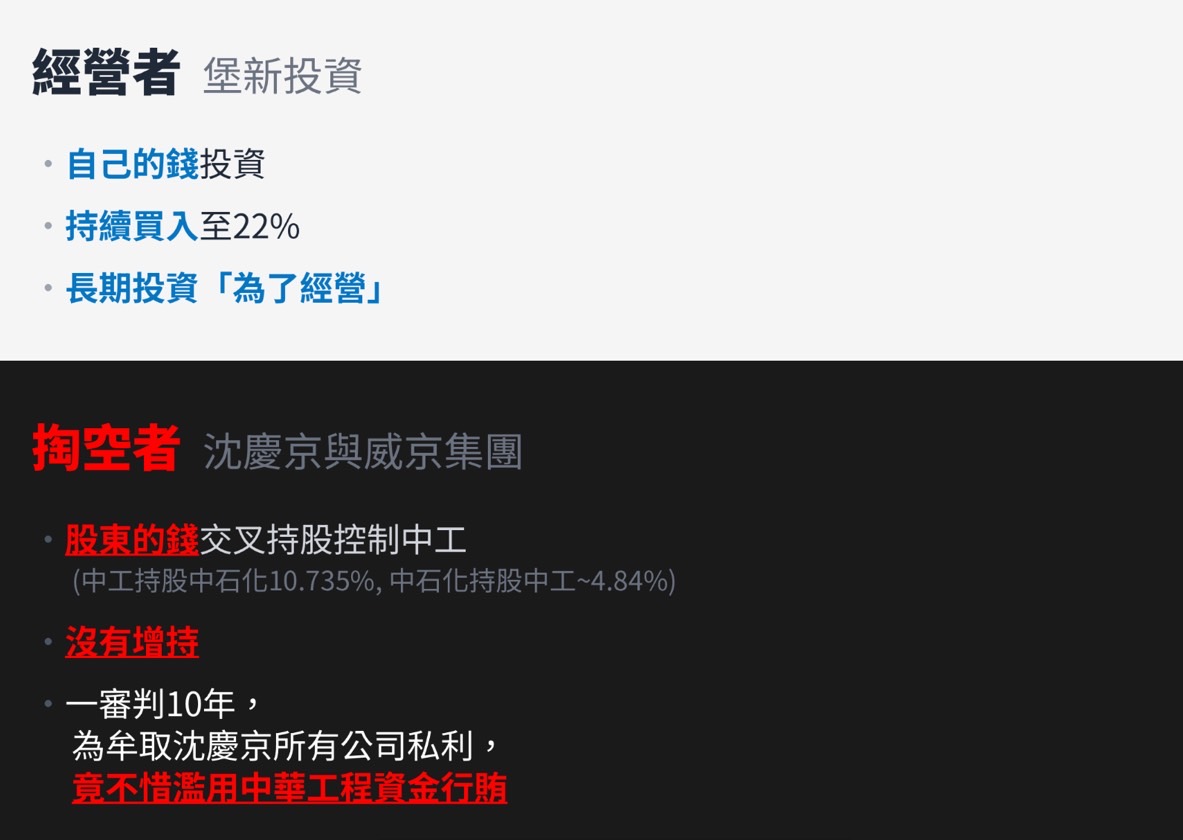 第二大訴求是「司法認定」,拒絕共犯結構續掌公司:台北地方法院認定沈慶京為爭取京華城容積率,牟取威京集團京華城公司之私利,從中華工程公司以捐款名義行賄,有哪些董事與高階主管知情默許沈慶京濫用資金,股東絕不容許任何蠹蟲繼續吃裡扒外,依法訴究共犯法律責任。