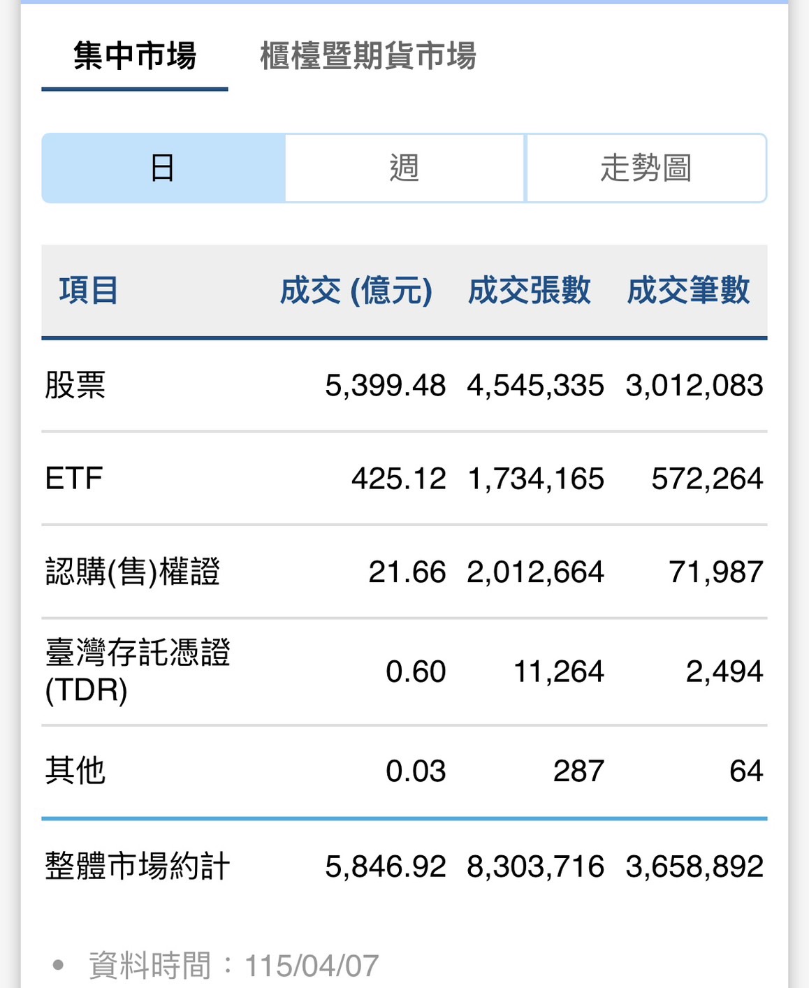 根據臺灣證券交易所統計,上週(115/3/30~115/4/2)外資在集中市場總買進金額為 10,668.20 億元,總賣出金額為 12,269.47 億元,賣超為 1,601.27 億元。另統計自 115 年年 初至 4 月 2 日止,外資總買進金額為 15 兆 7,107.76 億元,總賣出金額為 16 兆 5,597.17 億 元,累計賣超為 8,489.41 億元。