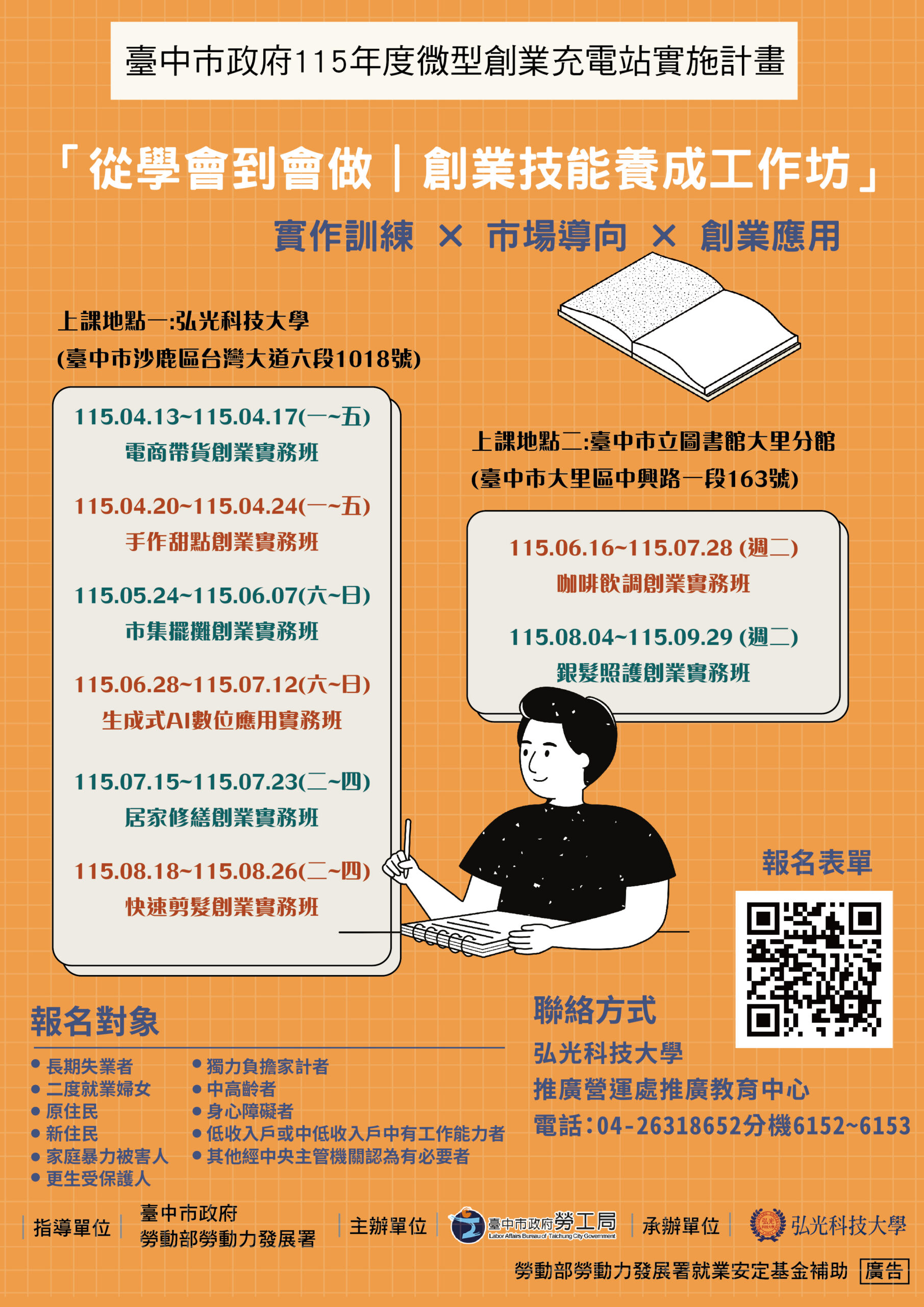 勞工局表示,歡迎有創業規劃或正在創業的市民把握機會參與相關課程與輔導服務,115年度活動資訊可至勞工局官網查詢(https://www.labor.taichung.gov.tw/1229008/1229015/1247865/1303755/1303769/1303770/post),或電洽04-22289111轉35616洽詢。