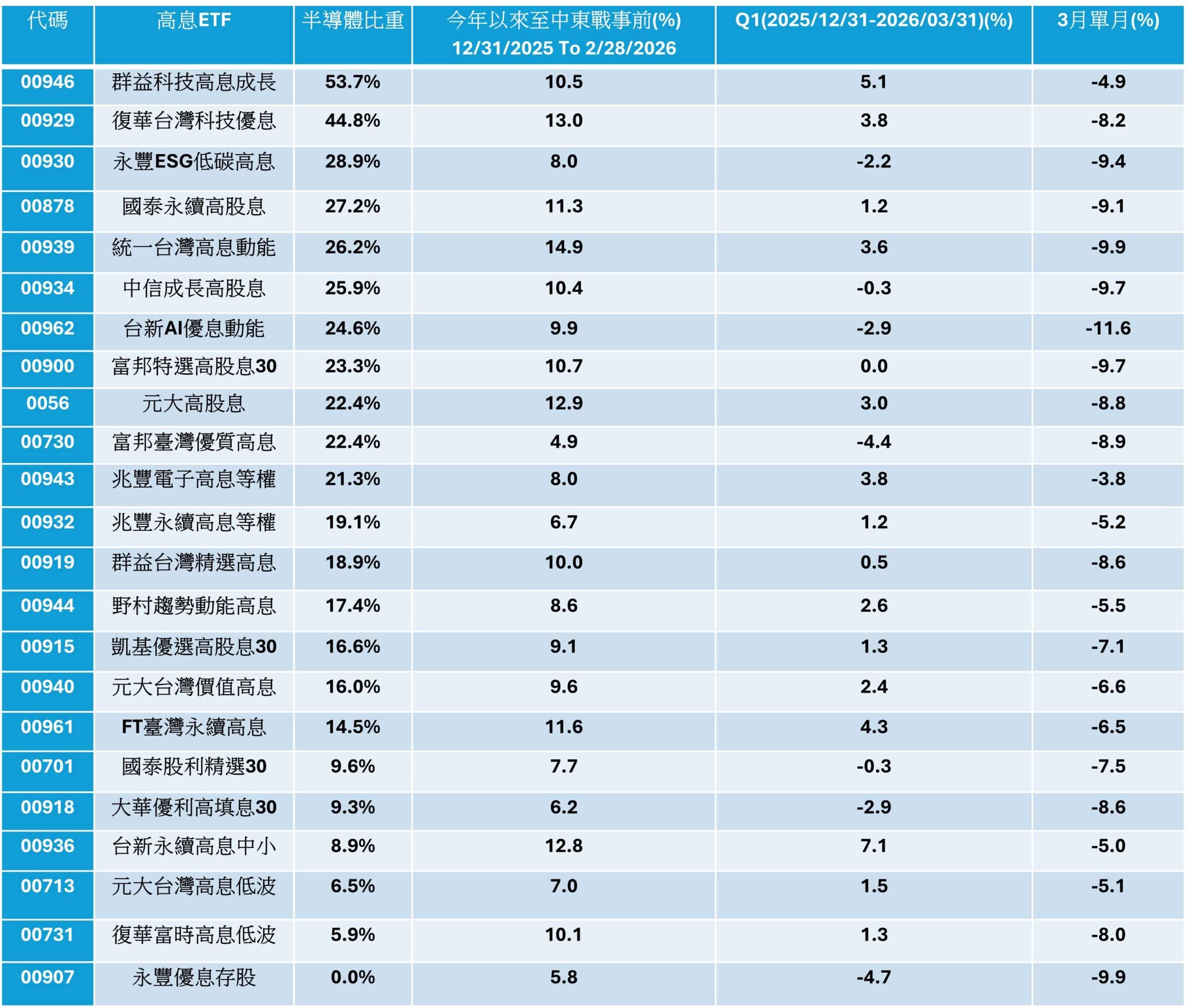基金醫生馮志源分析,根據理柏統計,截至2/28止中東戰事爆發前,00929前2月的績效就高達13%,高居所有高股息ETF第二,中東戰事爆發後,台股陷入震盪整理,全球及台灣科技股落難,半導體股比重高達近45%的00929 3月單月績效因此滑落8.2%,累計今年第一季績效表現仍達3.8%,而且過去17個月除息行情,有高達16次都是當天填息,4月更直接將月配息提高18%至0.13元,相對強勢的績效與填息表現令人激賞!