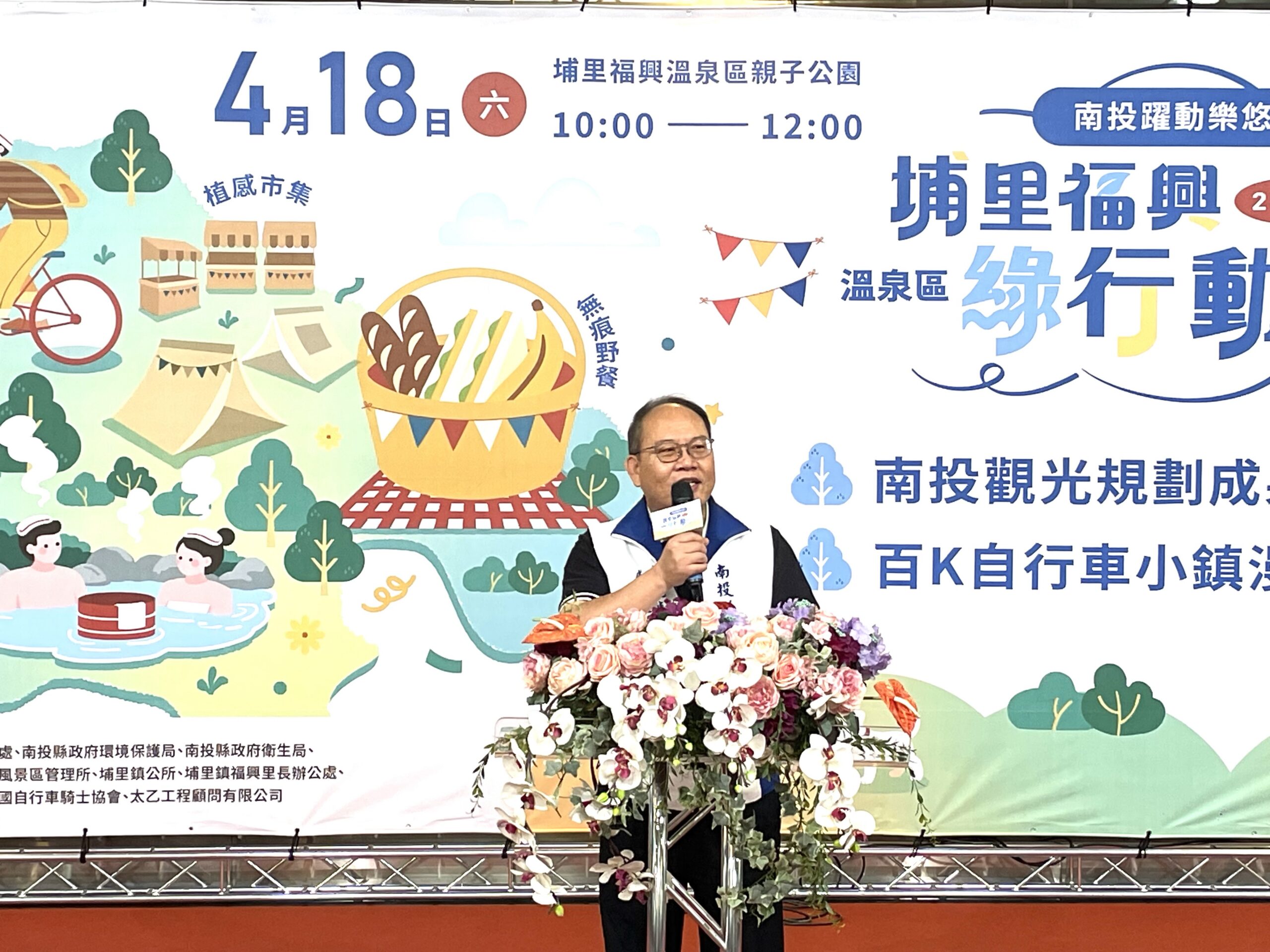 縣府觀光處長陳志賢表示,此次活動整合3大主題,包含「無痕野餐」、「百K自行車小鎮漫遊」及「南投觀光規劃成果展」,內容涵蓋無痕野餐體驗、蔬食市集、音樂展演、1200份永續主題闖關集章送好禮、單車騎行、觀光規劃成果展等多元活動形式,在綠意環境中參與活動,深化永續觀光理念,誠摯邀請全國民眾於4月18日走訪埔里福興溫泉區。