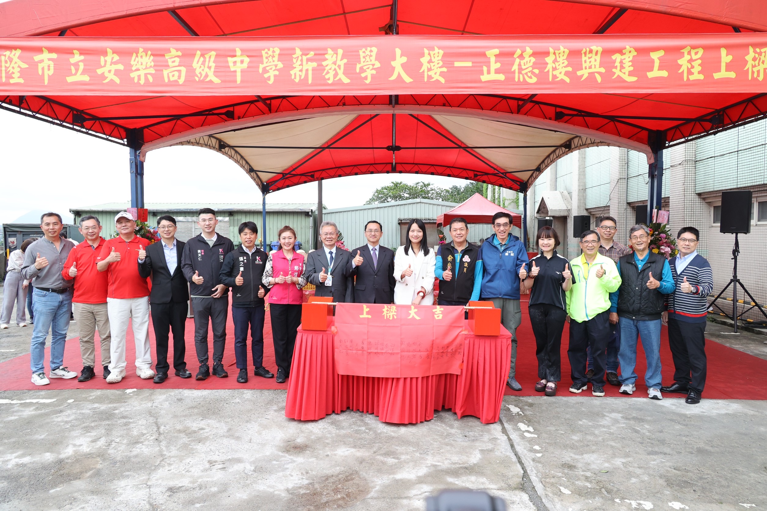 「樑升而起,構建杏壇綠建築」,歷經一年半施工,基隆市立安樂高中老舊校舍拆除改建(正德樓)工程於115年4月8日舉行上樑典禮,典禮簡單隆重,市府參議楊桂杰及與會貴賓共同焚香祝禱,祈福後續工程平安順利。