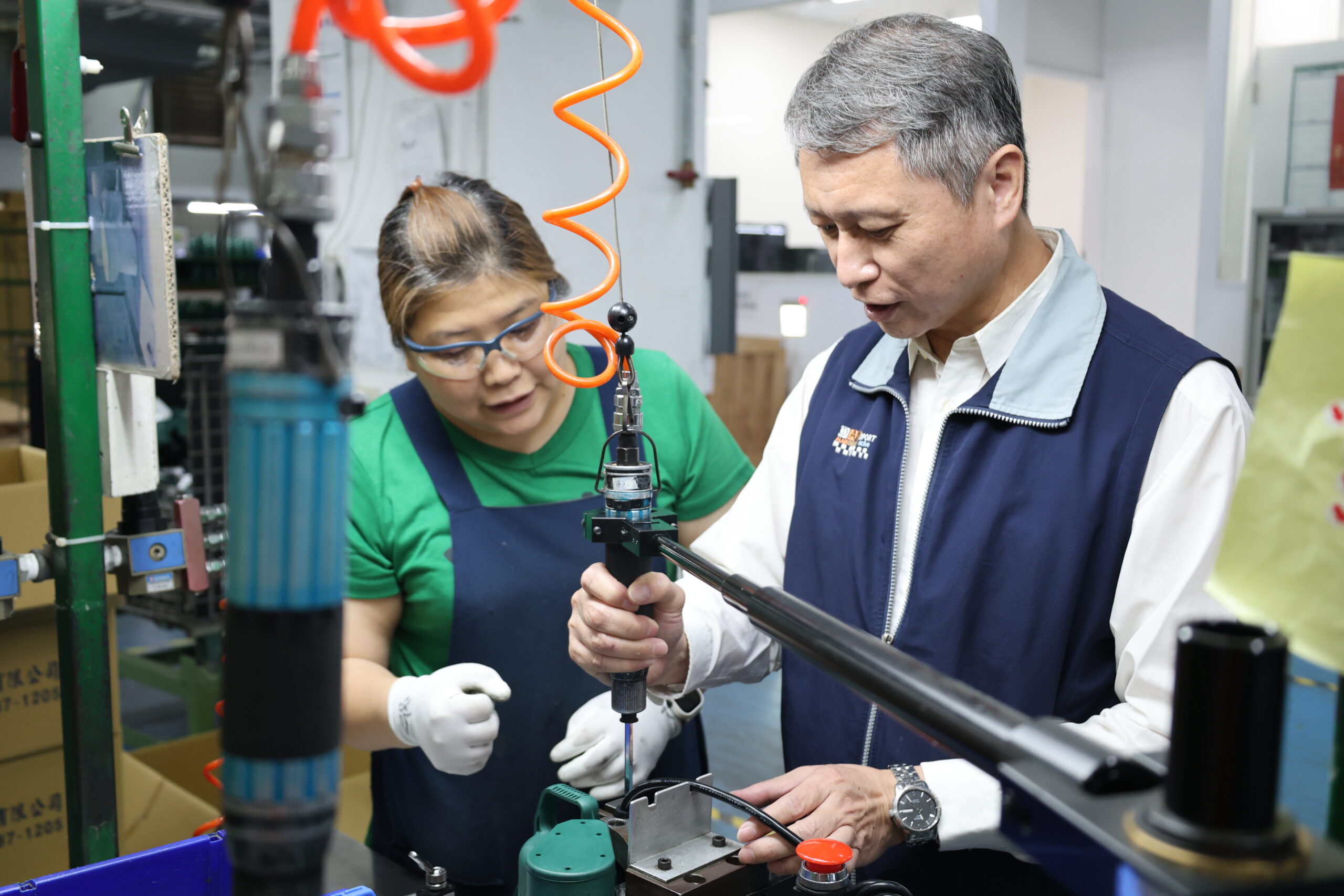 在泵浦組件區,陳瑞嘉親自挑戰曾被視為「魔王關卡」的鎖螺絲任務,在資深技術員洪欣怡現場示範後,站上抗疲勞減壓墊,手握氣壓式螺絲起子,動作俐落地輕鬆完成組裝。他指出,中高齡員工在職場上常面臨「視力、體力、肌力」三大挑戰,若沒有適當的輔具與設計,很容易造成疲勞甚至受傷。