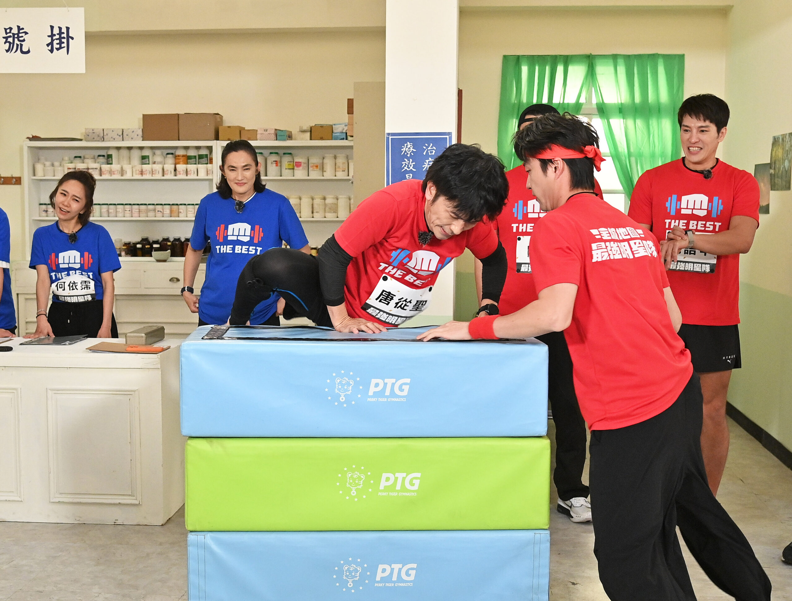 隨著比賽推進,一行人進入台視戲劇攝影棚,驚見製作單位將熟悉的拍攝場景全面改造為競賽場地,從客廳、廚房到醫院與街道一應俱全。場景設計也巧妙融入比賽元素,例如廚房關卡以米袋取代沙包、街道關卡則用紙箱代替槓片,創意十足,而王盈凱在「紙箱弓箭步」的精彩軟Q表現更讓主播蔡尚樺、徐凱元讚嘆行走如行雲流水,增加不少賽事看點。