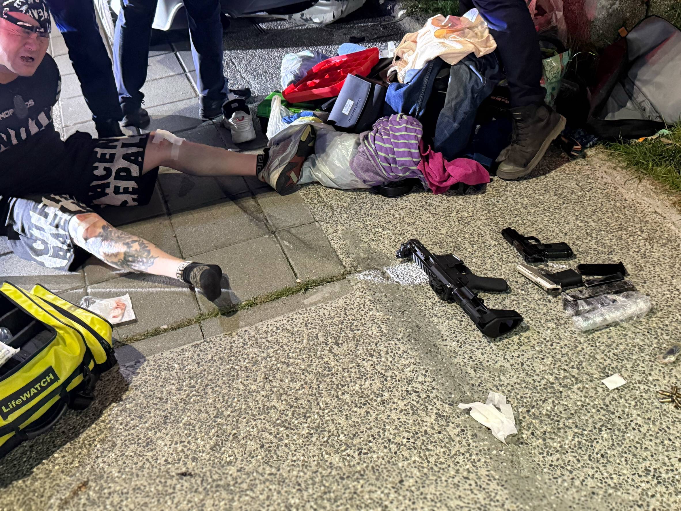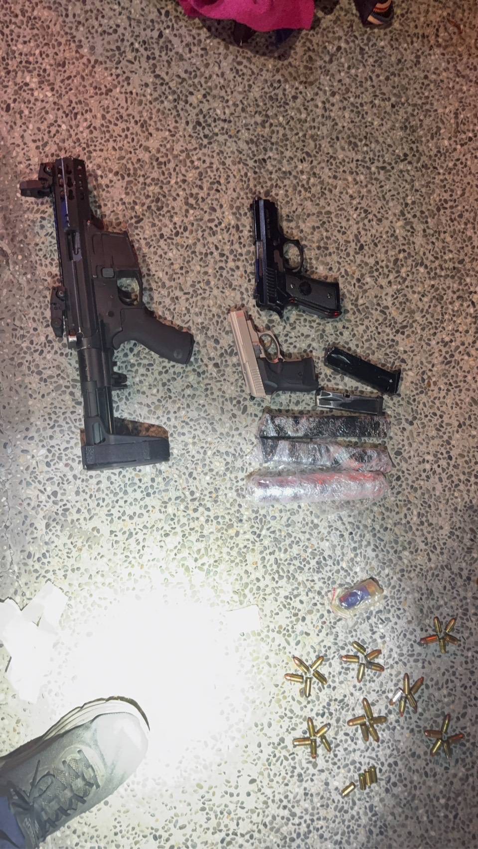 經警方現場附帶搜索,查獲長槍1把、短槍2把、子彈67發、霰彈1顆,以及第二級毒品依託咪脂及相關器具等證物。相關槍彈已送鑑驗其殺傷力,毒品部分亦待檢驗確認。