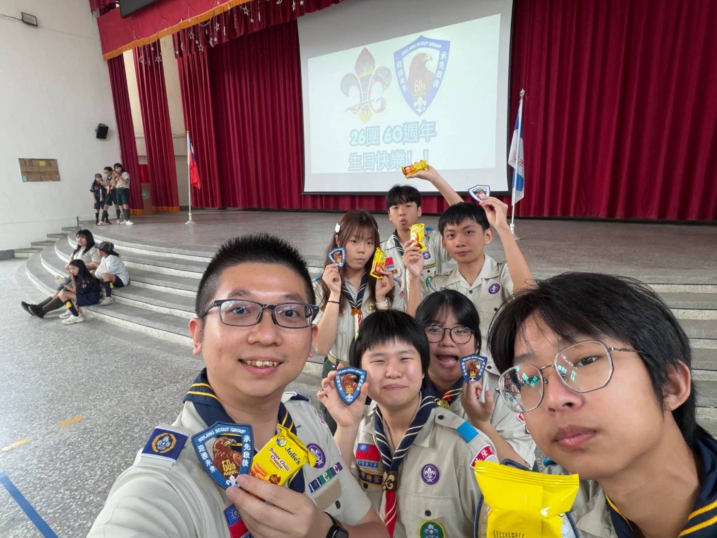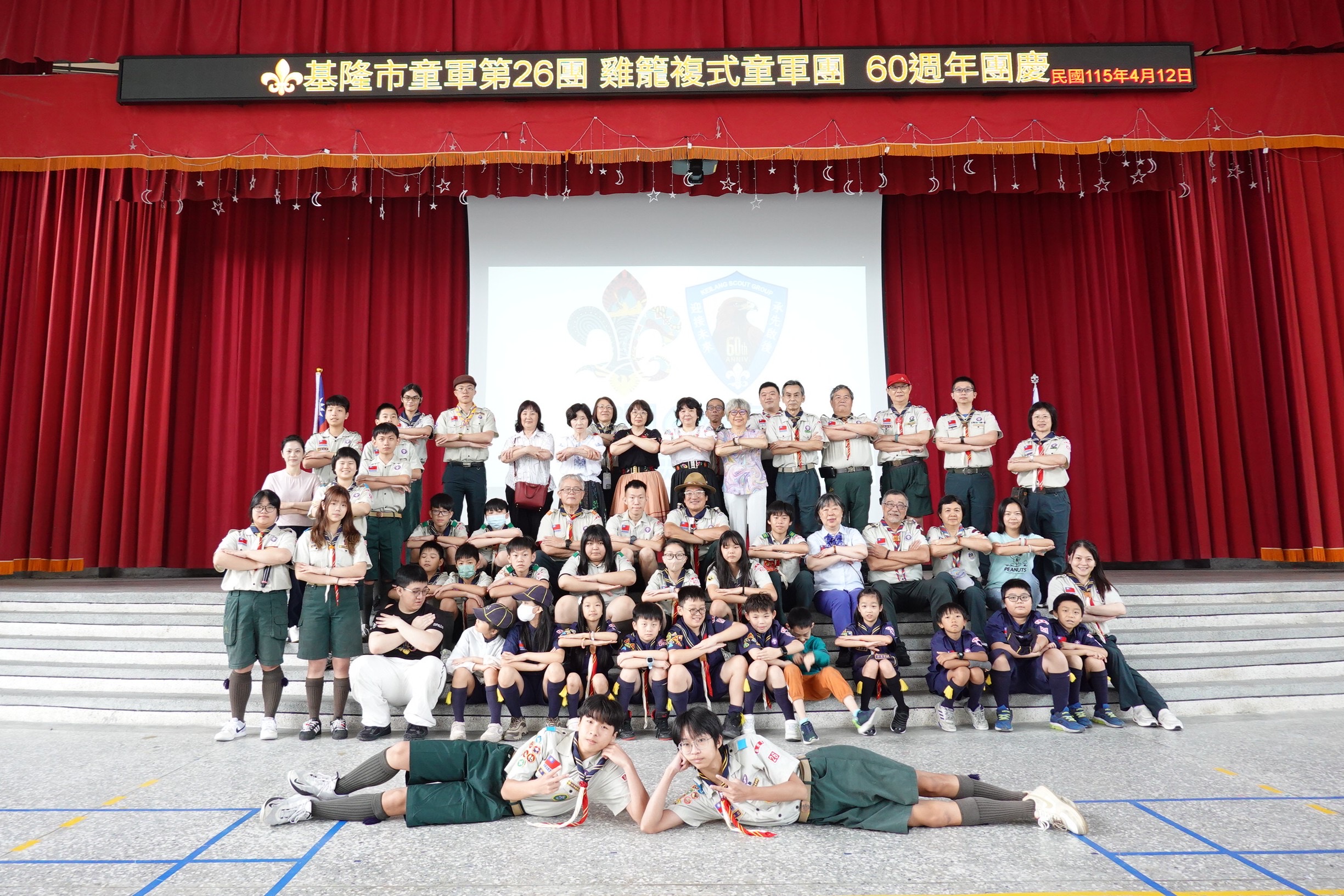 基隆市童軍第26團今日於八斗國小禮堂盛大舉辦「成立60周年團慶」。現場老、中、青三代童軍齊聚,場面溫馨感人。新任團務委員會主任委員林志嘉特別以「AI協作」的幽默開場,分享自己從民國67年小學四年級參與營隊至今的深厚情緣,強調「活到老、學到老」的童軍精神。