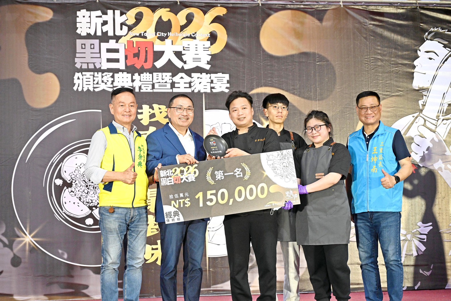 「2026新北黑白切大賽」冠軍出爐!新北市政府11日舉辦頒獎典禮暨全豬宴市集活動,今年經典傳統組冠軍由「古早切仔麵」蟬聯,職人創新組冠軍由「隱居居酒屋」奪下。新北市長侯友宜頒獎時表示,黑白切是臺灣傳統的庶民美食,品嘗黑白切不僅是種享受,也讓臺灣傳統美食得以不斷傳承延續,在庶民美食底蘊中增添更多臺灣味與人情味。