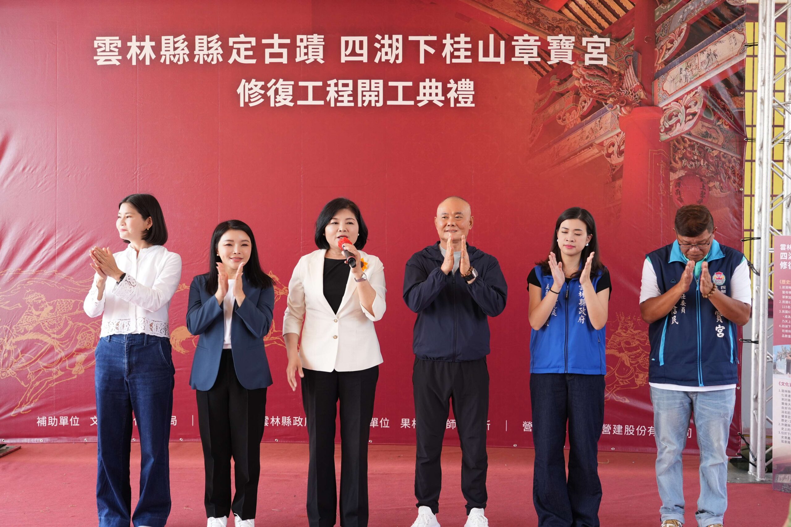 雲林縣「縣定古蹟四湖下桂山章寶宮修復工程」13日舉行開工典禮,縣長張麗善、副縣長陳璧君與各界來賓出席,共同見證重要文化資產修復里程碑。章寶宮修復工程總經費6000萬元,由中央補助5,400萬元、縣府與廟方各自籌300萬元,工程分兩期執行,預計117年完工。