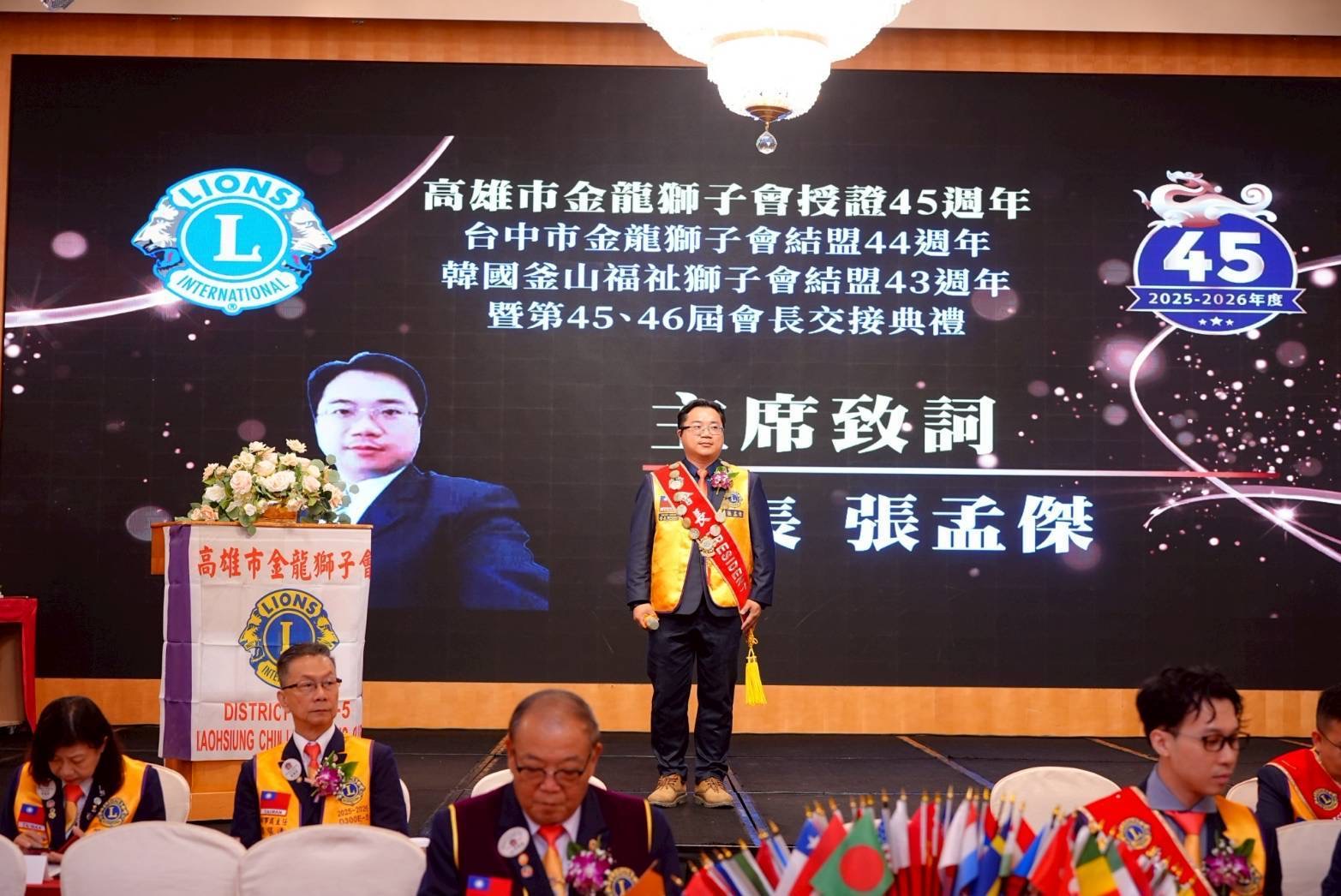 高雄市金龍獅子會日前於高雄漢來飯店隆重舉行第 45 屆授證典禮,象徵年度會務完成並為新一屆揭開序幕。典禮現場冠蓋雲集,嘉賓雲集,眾多政商界及獅友貴賓齊聚一堂,共同見證會長張孟傑接受國際獅子會授證。
