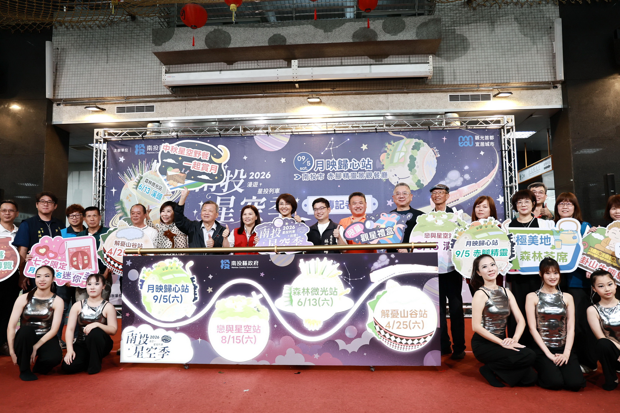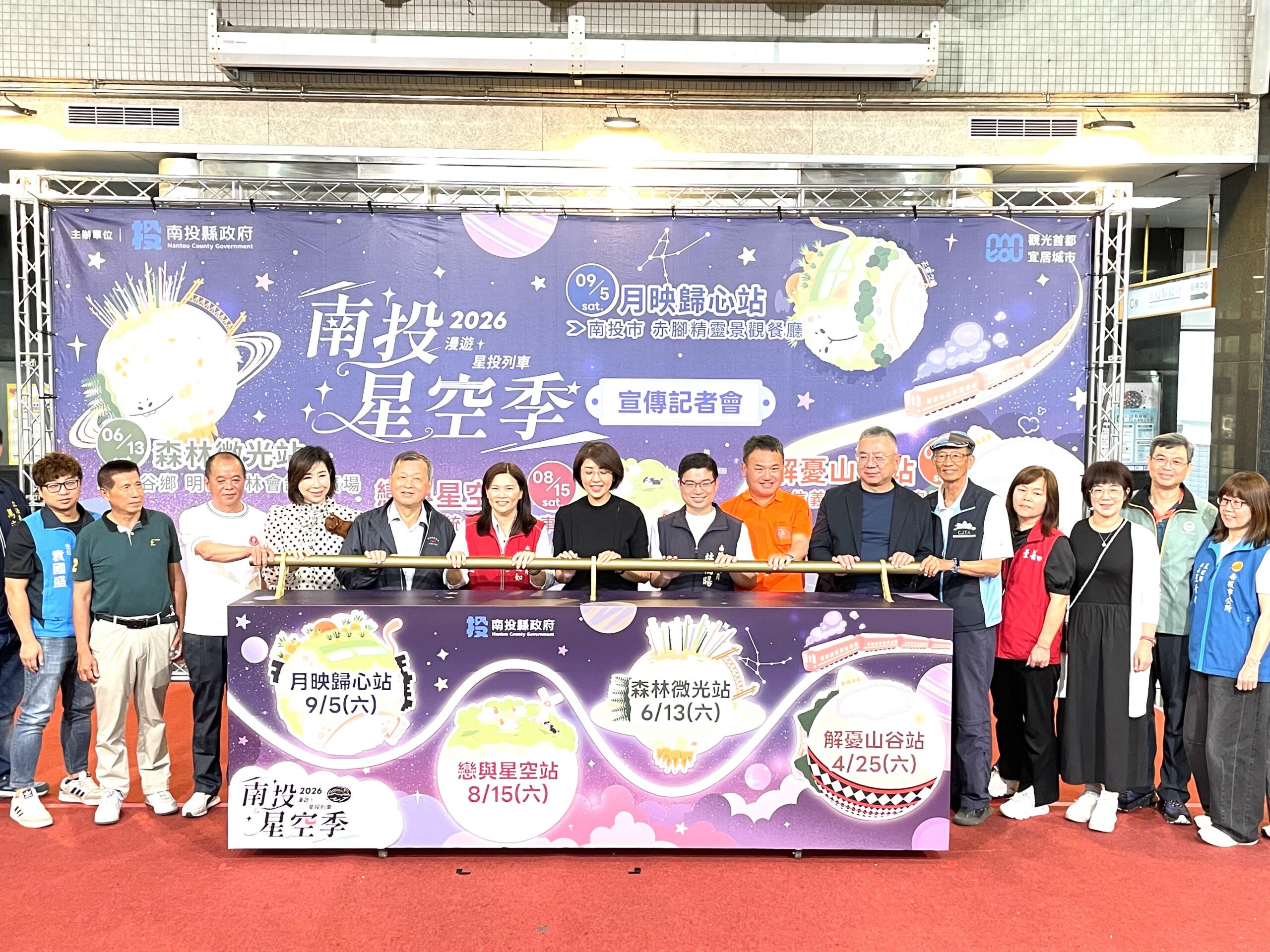 包括副縣長王瑞德、縣議員林憶如、林儒暘、清境農場場長王仁助、縣內各觀光旅遊發展協會代表多人都到場共襄盛舉,並一起啟動星投列車,象徵星空季活動正式展開。記者會中也由承辦4場次活動的東埔溫泉觀光協會、太極美地發展協會、清境觀光協會及至善文化關懷協會等代表上台展示宣傳。