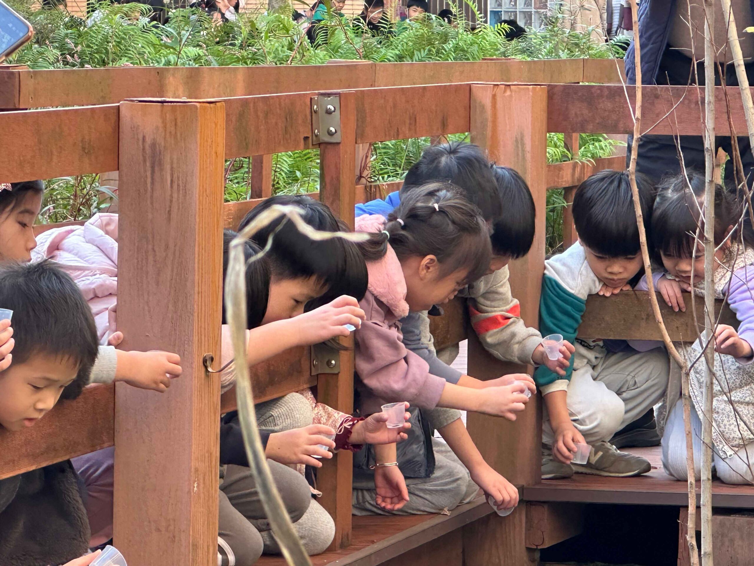 此次整合校內生態池與生態小溪,同時引導孩子親手投放螢火蟲的食物與幼蟲,親身體會「迎螢火蟲回家,綻放夜之光采」的美好願景。 [圖:臺北市政府教育局]