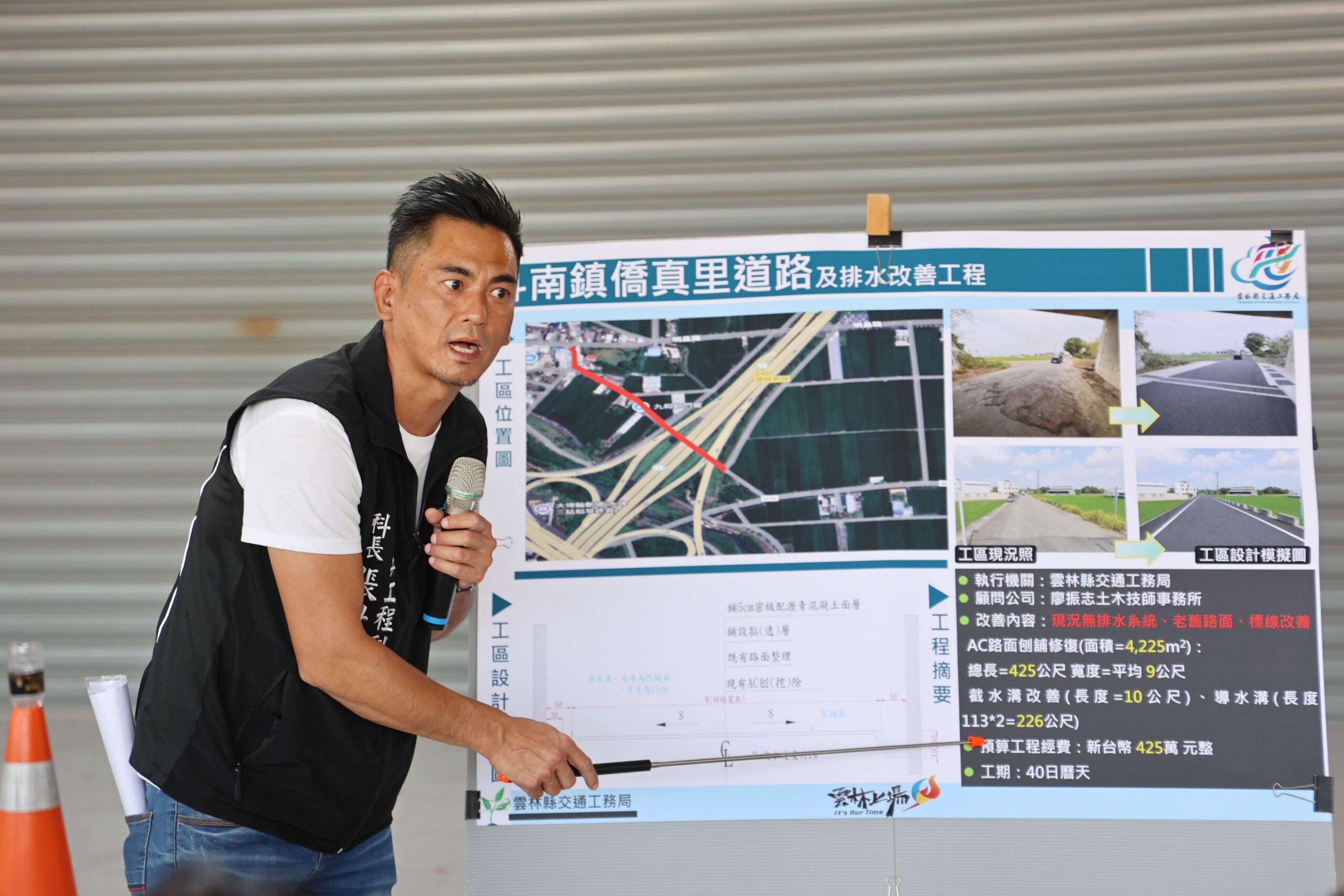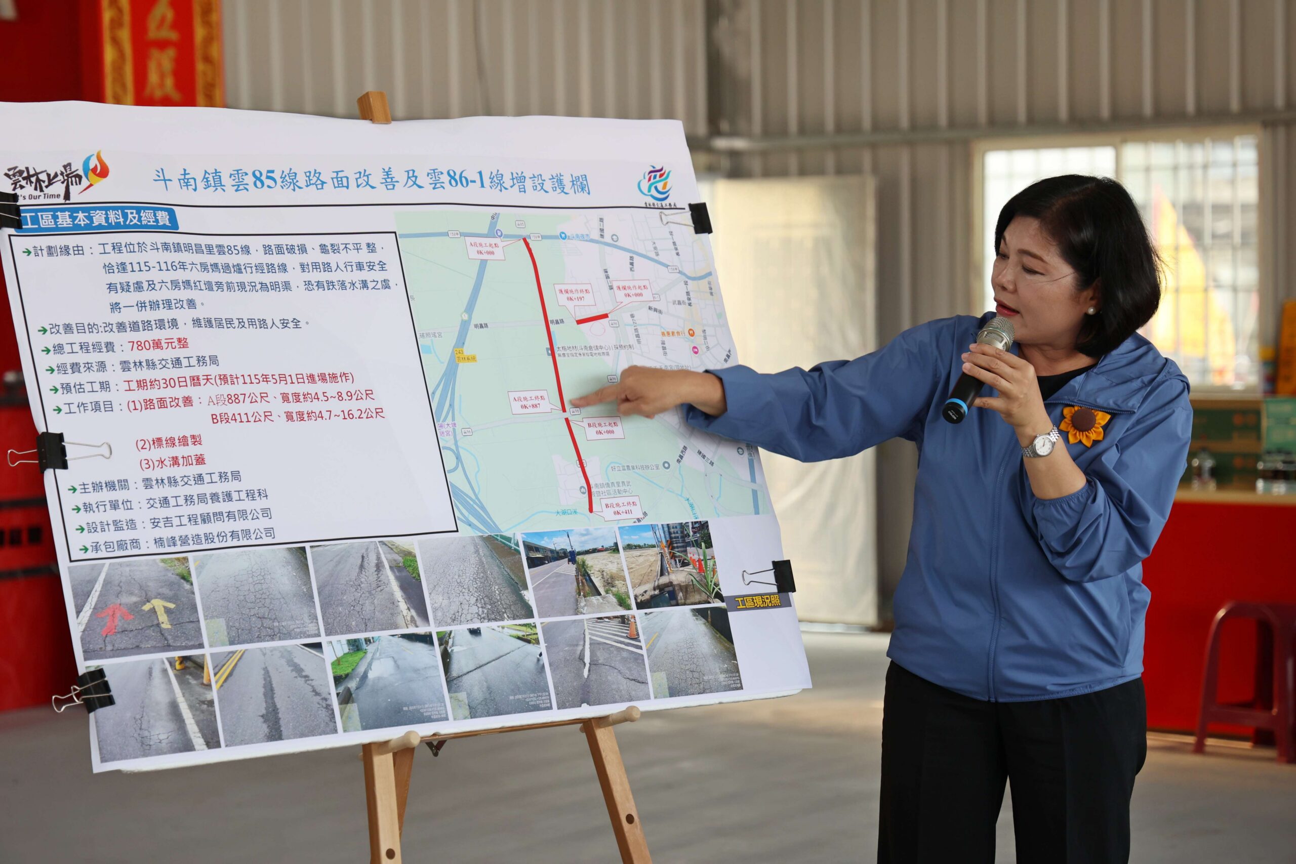 雲林縣交通工務局局長汪令堯說明,斗南鎮雲85線路面改善工程,預計改善道路總長約為1,298公尺,A段887公尺、寬度約為4.5-8.9公尺;B段411公尺、寬度約為4.7-16.2公尺,工程總預算為新台幣780萬元整;此外雲86-1線為紅壇前主要通行道路,現況為明渠,行人恐有跌落溝渠之虞。針對雲86-1線溝渠或新設塊狀護欄、反光導標或改善舊有護欄,交工局就地方建言並透過專業評估加強側向防護,全面提升行車安全。