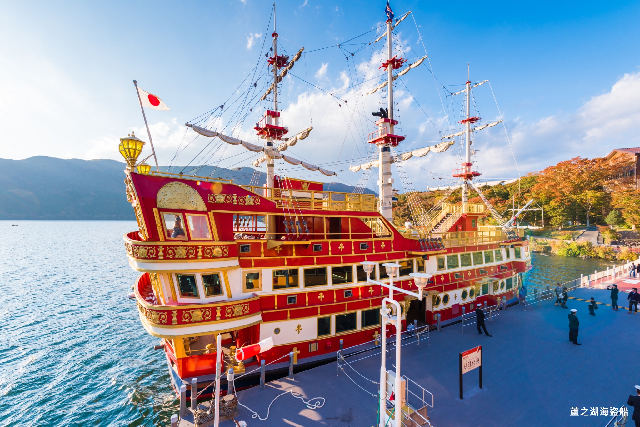 ▲箱根最熱門的觀光行程之一,以17-19世紀歐洲戰艦為原型打造,航行於箱根最大火山口湖「蘆之湖」。旅客可搭乘海盜船遊覽湖光山色,並遠眺富士山與箱根神社「平和之鳥居」。(圖/航典國際旅行社提供)