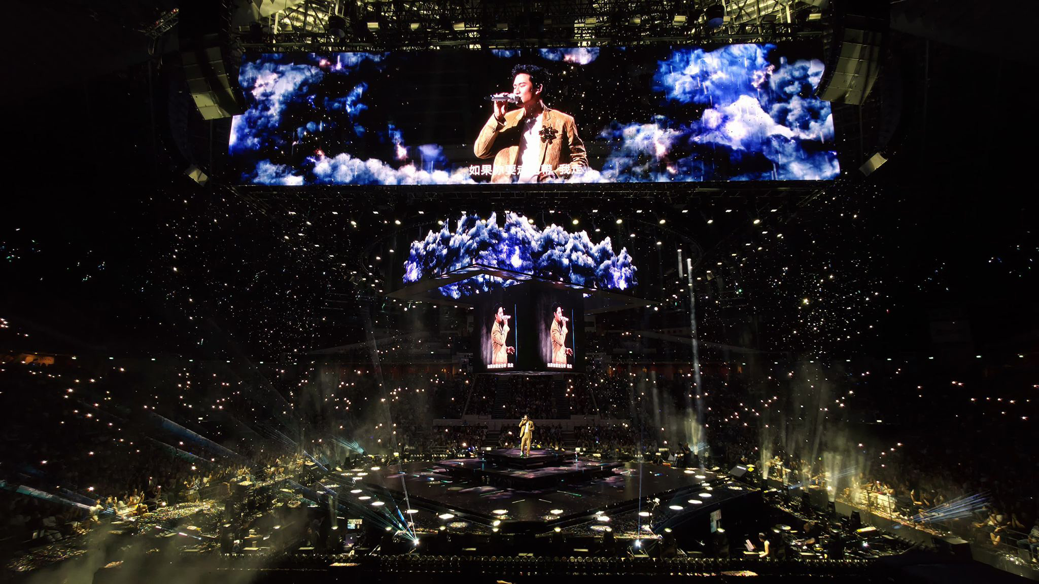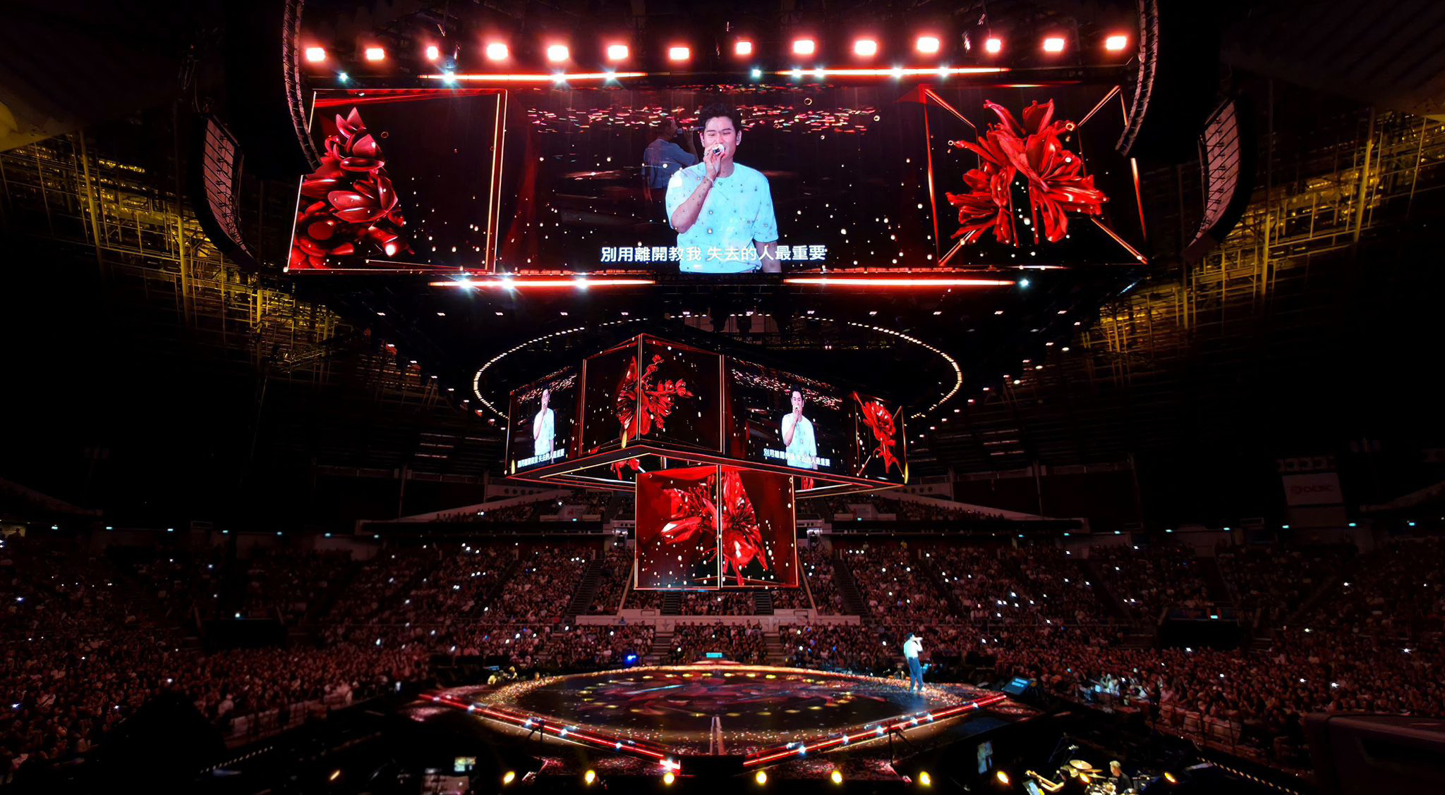 此次全新版本誠意滿滿,可說是「頂天立地」舞台全面升級。「頂天」以巨型高達天花板的「鑽石型三層LED恆星航母」設計,加大加滿的視覺規格,讓場館每一個角落都能清楚看見舞台上的周興哲;而「立地」部分則將四面台地板全面鋪設LED,形成360度無死角的沉浸式空間。觀眾席與天花板同步投射各色燈光與雷射,層層交織出沉浸式銀河效果,象徵與「小興星」一同沐浴在周興哲的音樂宇宙之中,視覺與情緒全面包覆,打造極致的視聽饗宴。