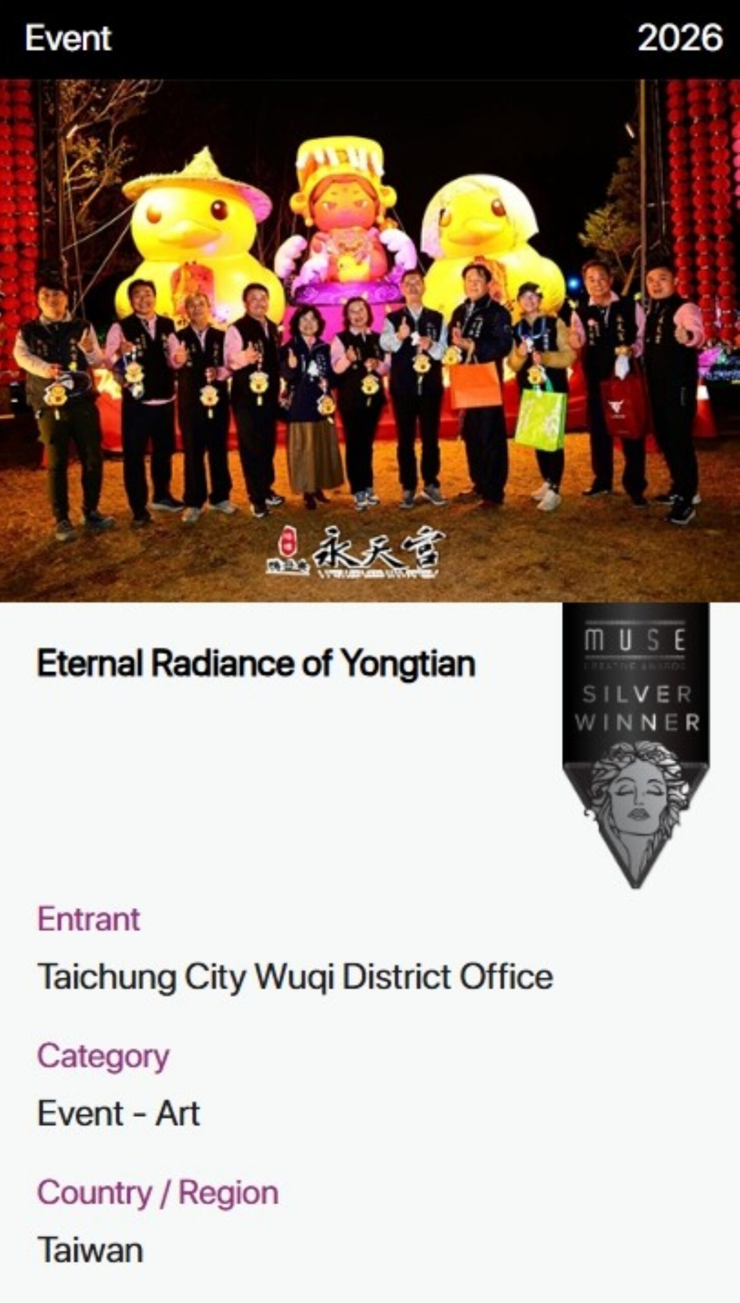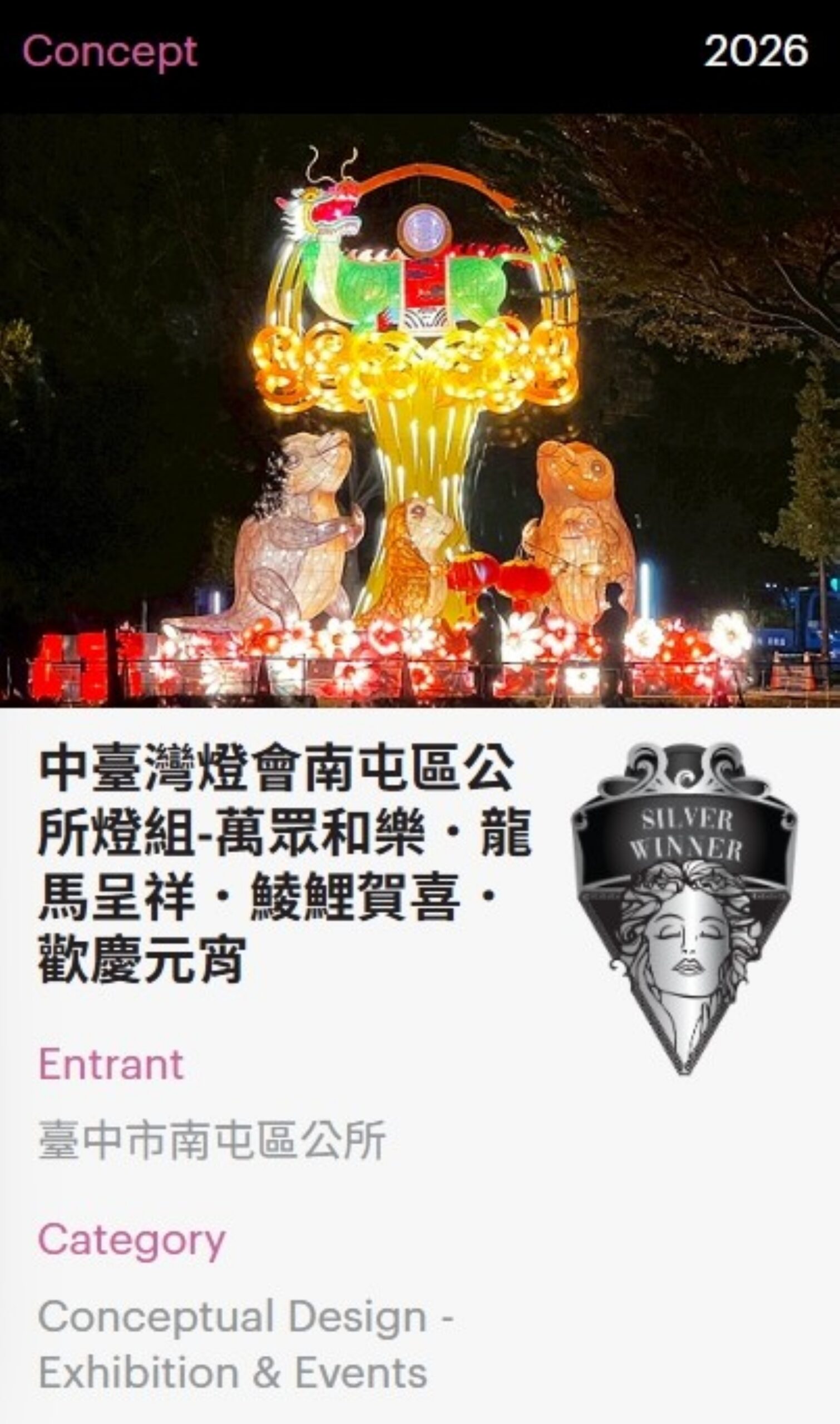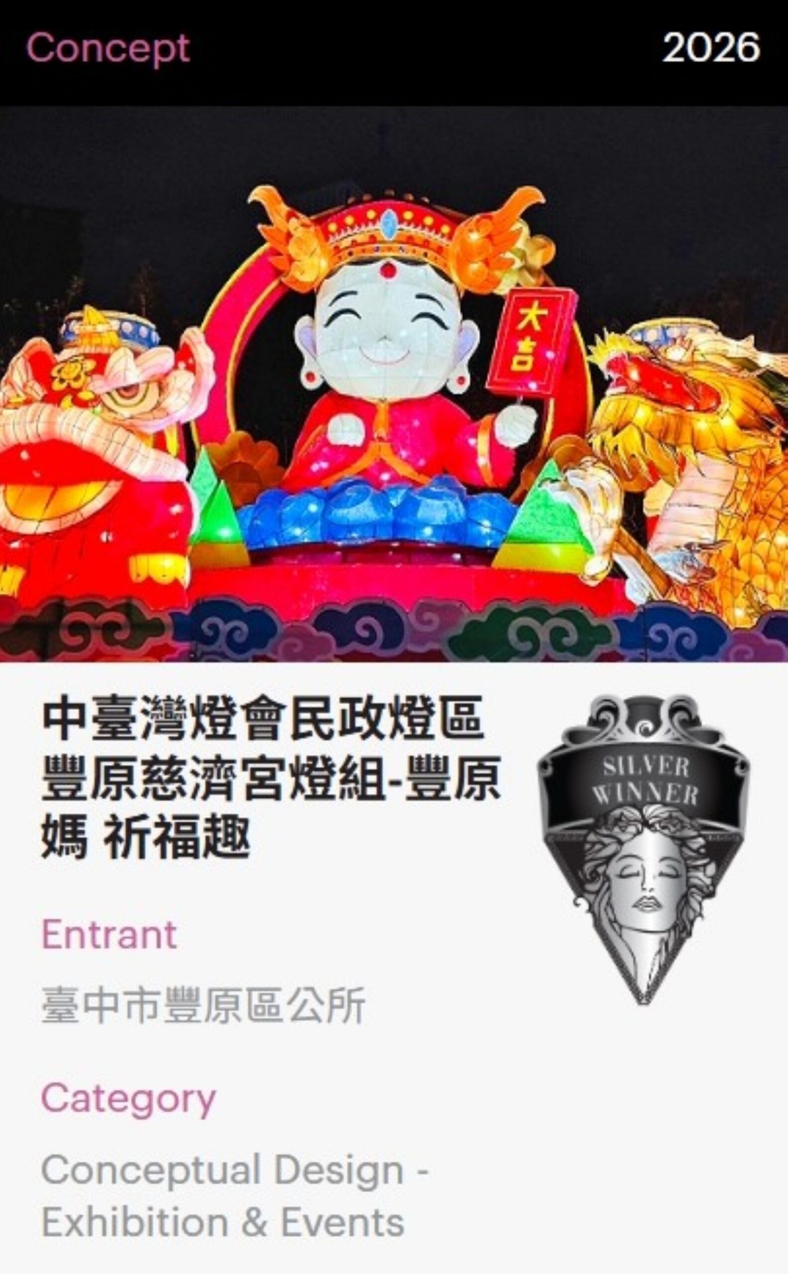 2026中台灣燈會再傳國際獲獎捷報!由台中市政府民政局打造的「幸福祈願村」燈區,融合傳統信仰、地方文化與當代美學,以創新策展理念勇奪2026美國謬思設計及創意大獎5項殊榮,一舉拿下2金3銀佳績。民政局長吳世瑋表示,此次獲獎不僅是對市府團隊與在地參與單位的高度肯定,更彰顯台中深厚的文化底蘊與亮眼的設計實力,讓世界看見台中作為文化創意城市的獨特魅力。