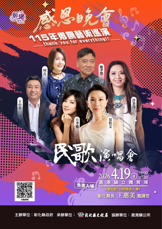 彰化縣政府持續推動藝文下鄉,115年「感恩晚會-鄉鎮藝術巡演」自4月起熱鬧展開,4月18日及19日將於鹿港鎮立體育場連續兩天晚上7時舉辦大型戶外演出,分別邀請優人神鼓帶來《踏風而行》,以及多位知名歌手共同演出民歌演唱會,以截然不同的藝術形式,為民眾呈現兼具震撼與溫度的藝文饗宴,皆免票入場。縣長王惠美邀請鄉親把握機會,一同沉浸於春夜的藝文氣息。