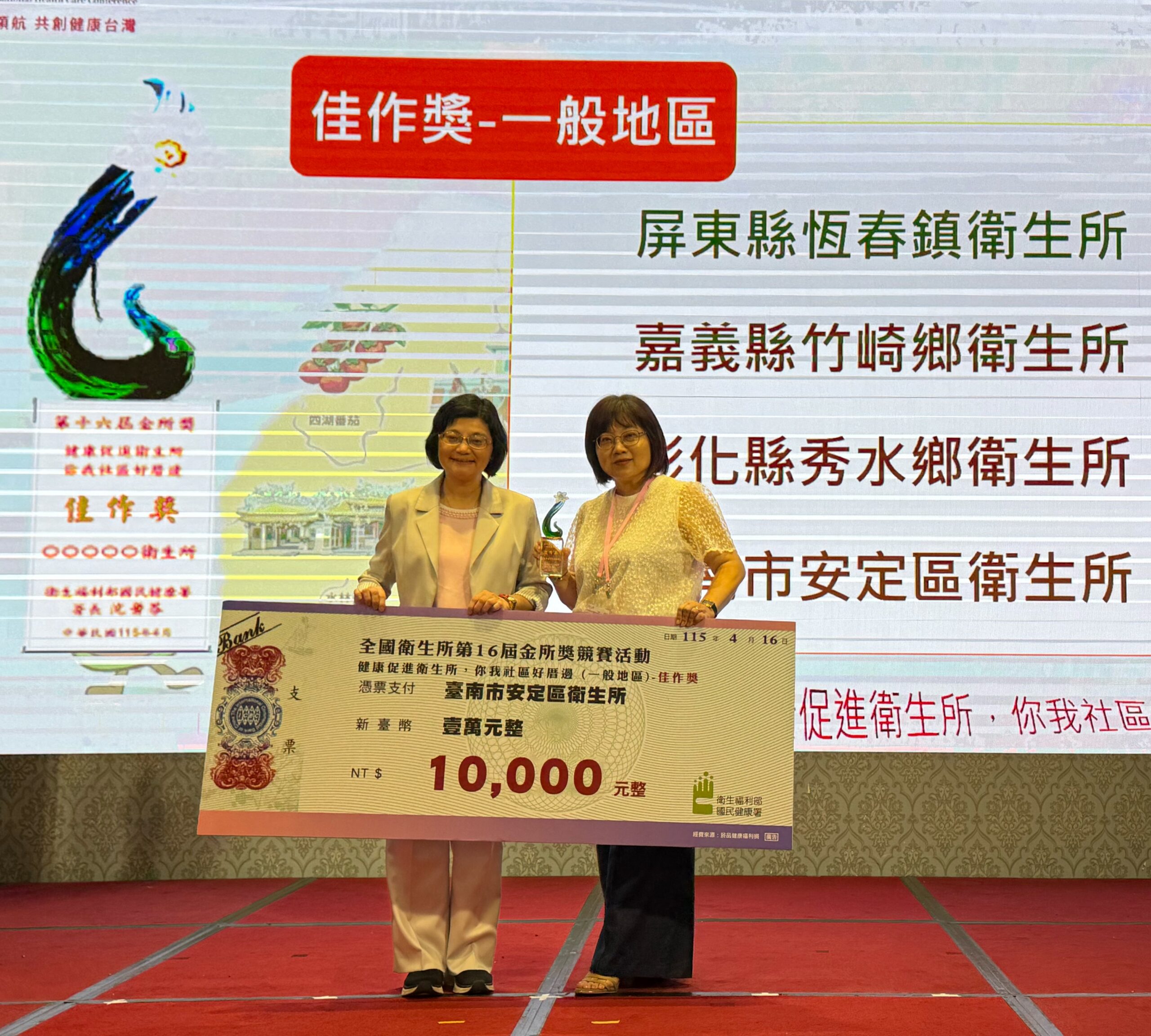 另外,安定區衛生所更以優質的基層服務脫穎而出,榮獲「金所獎佳作」,展現臺南基層公共衛生深耕在地、成效卓越的能量。