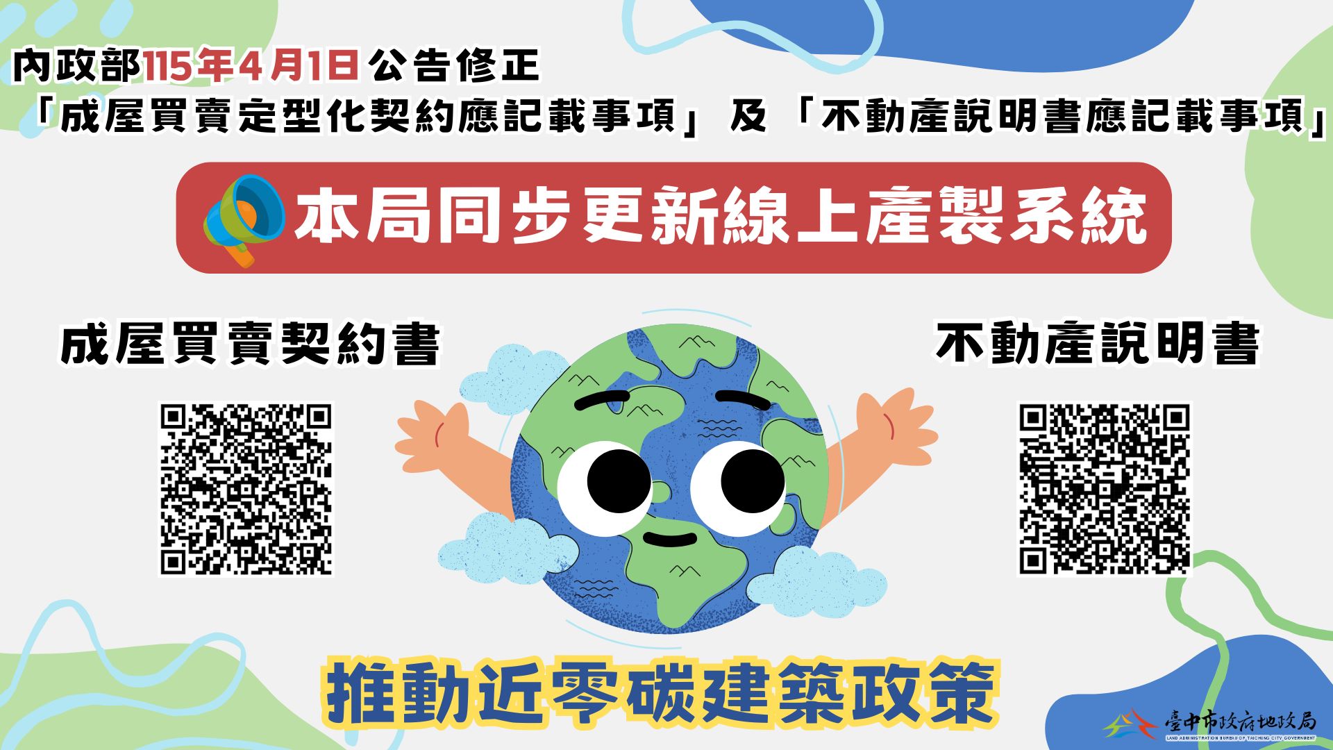 為鼓勵業者使用符合法規的契約書及不動產說明書,台中市政府地政局全國首創「成屋買賣契約書」及「不動產說明書」線上產製系統,因應此次內政部修正重點,完成系統更新,提供即時、正確且便利的資訊,供業者及民眾知悉。