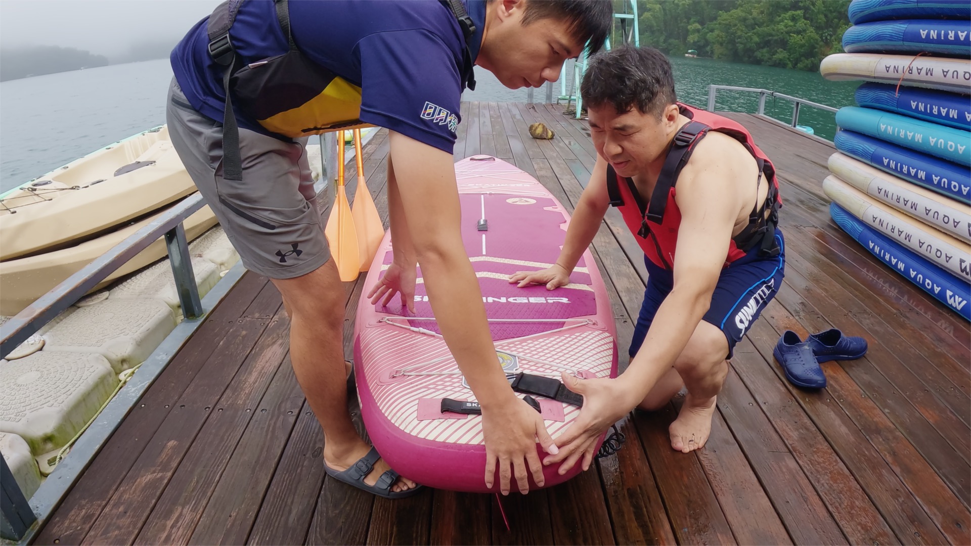 教練陳弘諺(左)細心引導林家興(右)從觸摸SUP裝備開始學習。圖片提供:公視