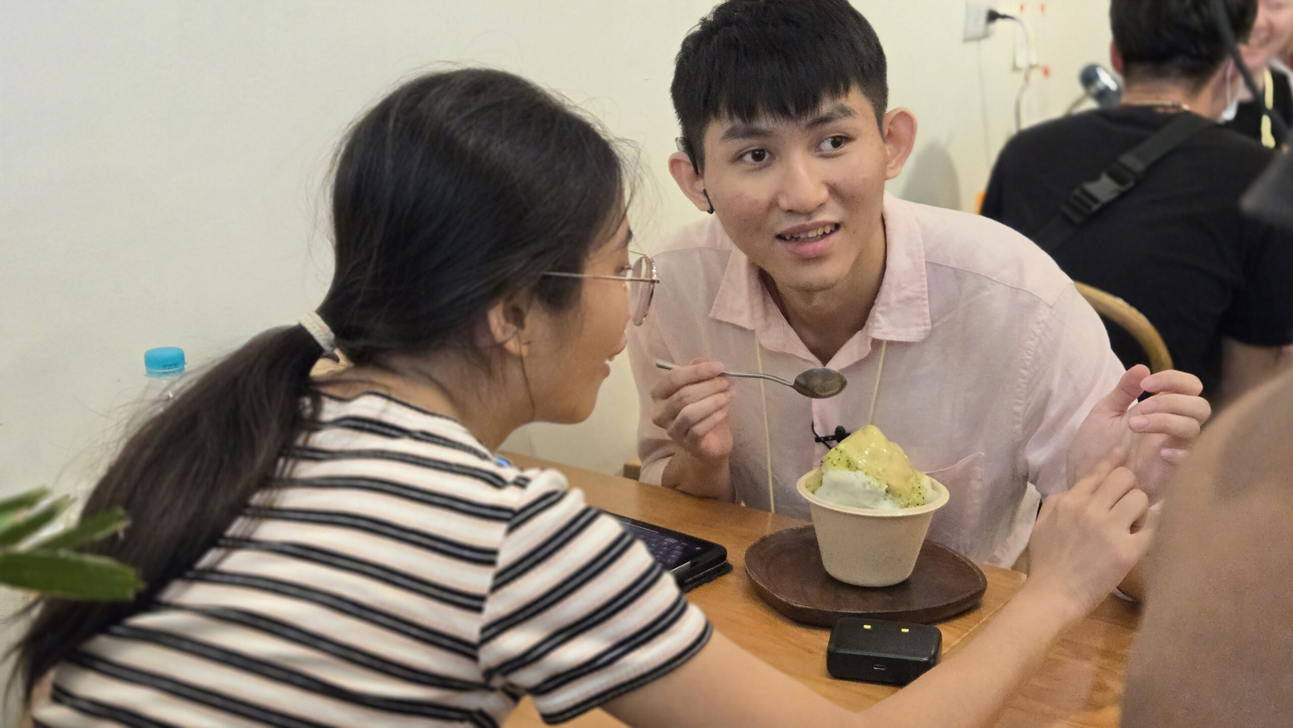 明眼夥伴在黃靖騰的手上寫注音溝通,與黃靖騰開心互動。圖片提供:公視