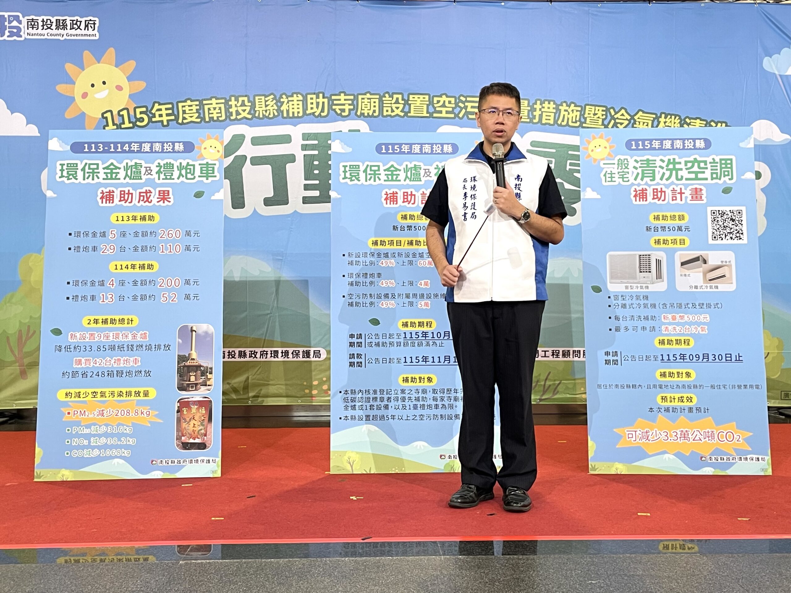 南投縣政府今(17)日舉辦「低碳行動.淨零未來」記者會,副縣長王瑞德代表縣府宣示,將持續推動寺廟環保設備補助,並首度新增一般住宅冷氣清洗補助,期許兼顧傳統祭祀文化與環境永續,穩步邁向淨零排放目標。