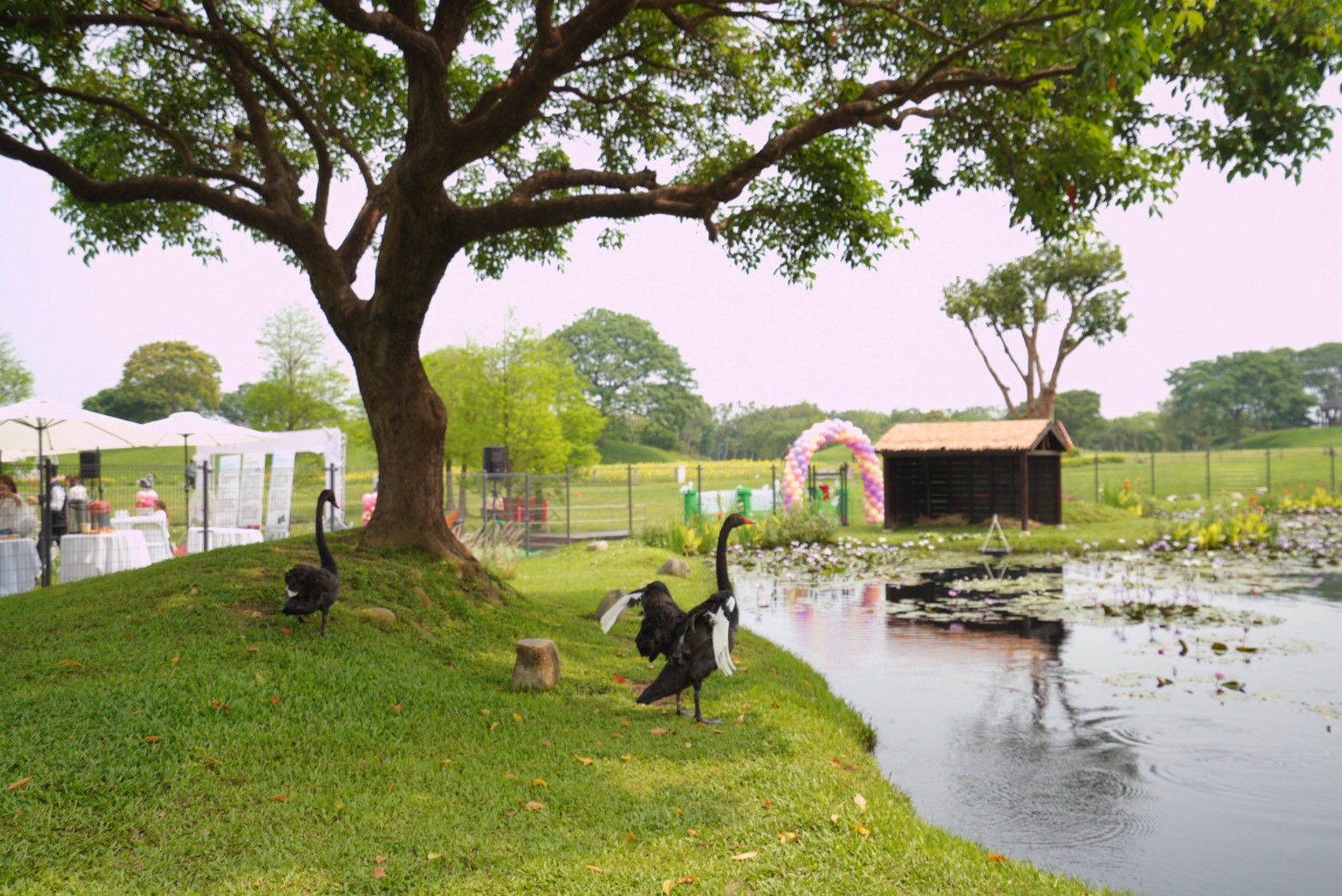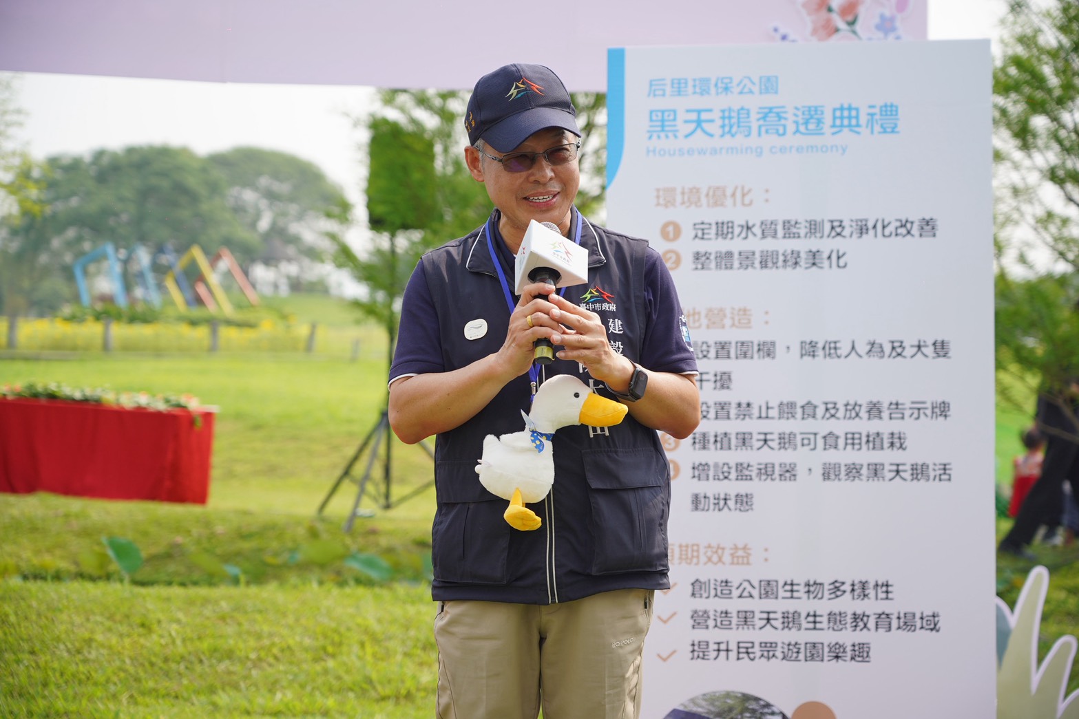 后里環保公園迎來黑色嬌客入住!市長盧秀燕重視自然環境與市民生活品質,積極推動多元綠地營造;繼秋紅谷與豐樂雕塑公園設置黑天鵝生態場域後,位於后里區的后里環保公園今(17)日正式迎接黑天鵝「喬遷新居」,成為全市第三處特色據點,不僅豐富園區生態樣貌,也提供市民親近自然的新選擇;今日喬遷活動由台中市政府建設局長陳大田主持,吸引不少地方民眾到場共襄盛舉,現場氣氛熱絡,大家紛紛捕捉黑天鵝初到新家的可愛模樣,見證園區再添新亮點的重要時刻。