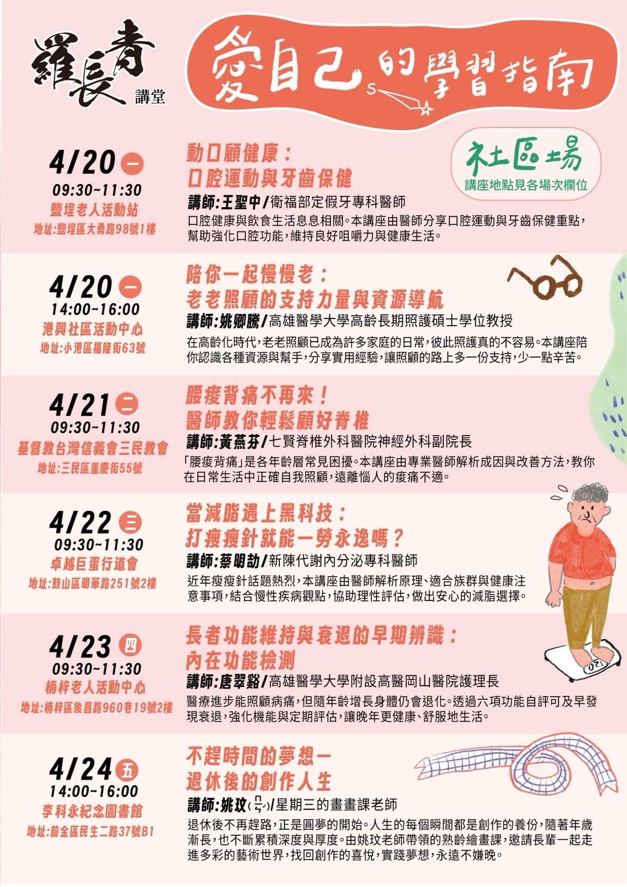 高雄市四維長青學苑由高雄市政府社會局主辦、社團法人高雄市社區大學促進會承辦,每年開設超過400門專屬高齡者課程,並於春、秋兩季定期舉辦「羅長青講堂」,邀請長輩與市民一同關注社會議題、培養思辨能力。本期講堂除於高雄市政府社會局長青綜合服務中心辦理外,亦深入圖書館、社區活動中心及教會等多元場域,擴大參與機會。
