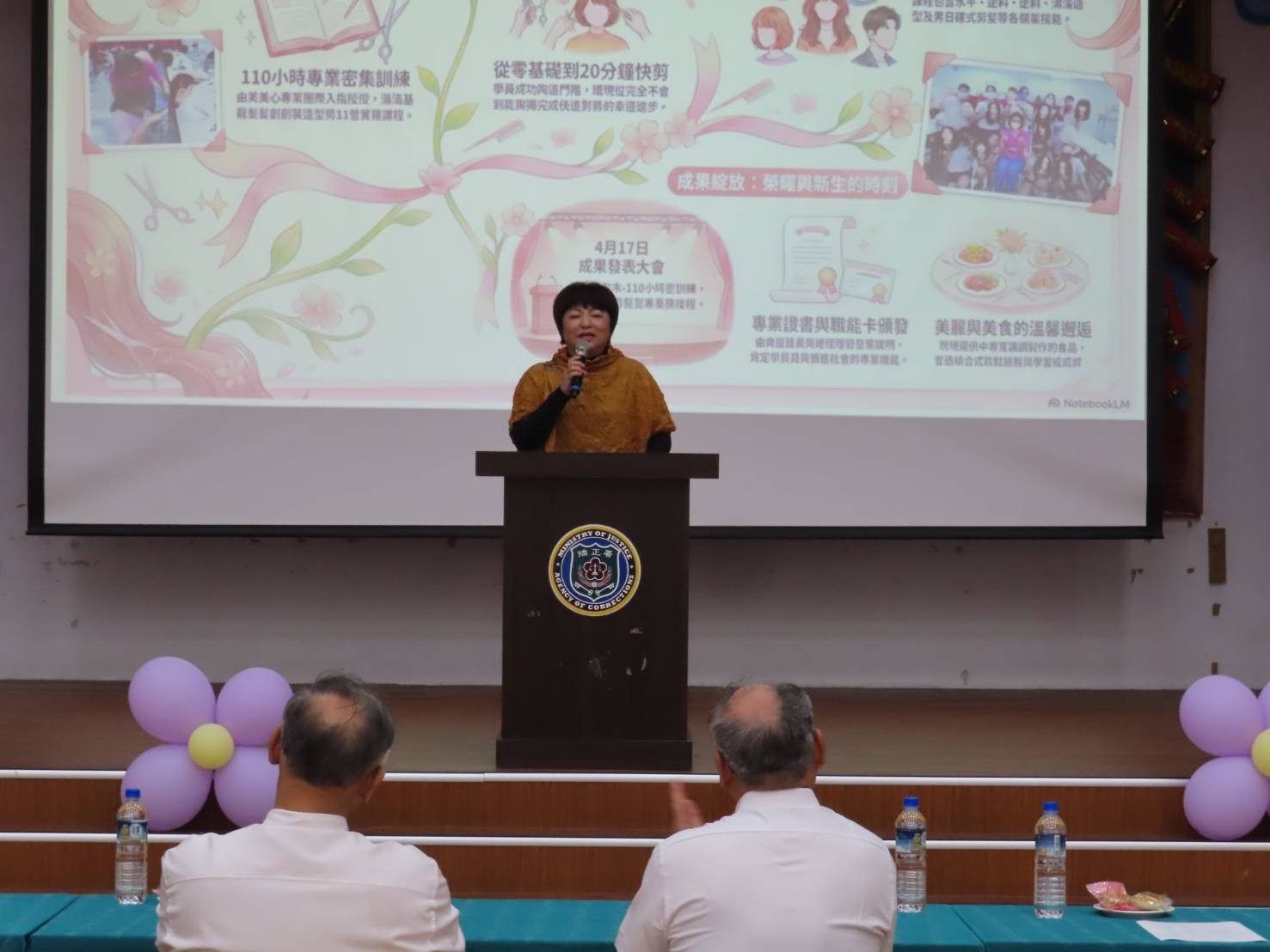 更保沈主委,也是剪髮訓練團隊「美樂心」美髮的總經理;上台給予同學鼓勵!