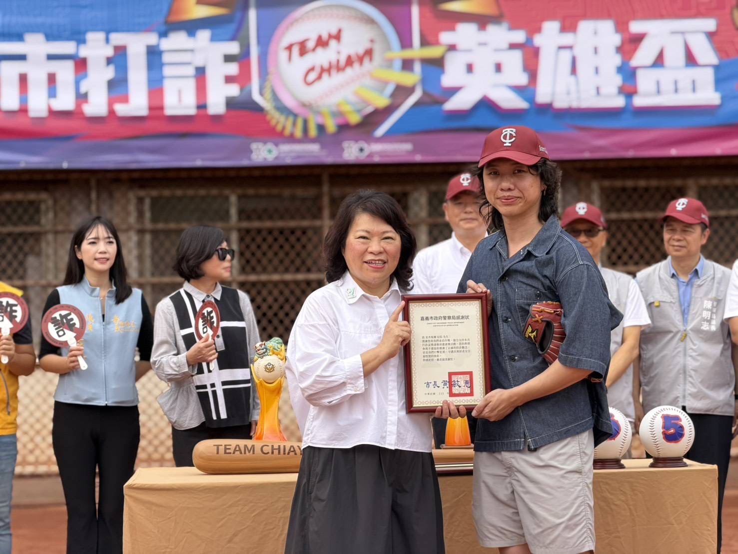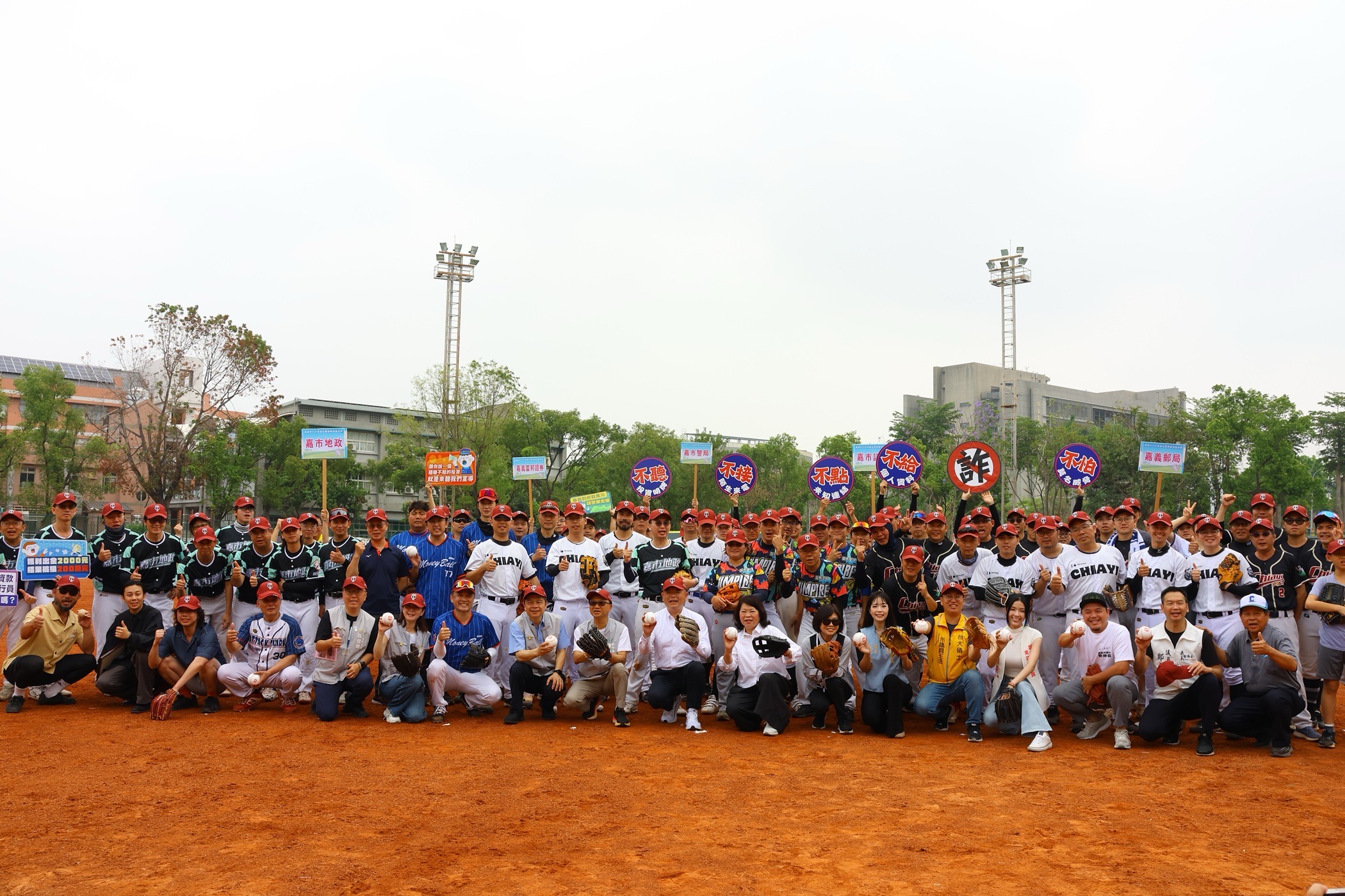黃敏惠市長表示,現下詐騙盛行,所帶來的不僅是財物上的損失,更破壞了社會之間的信任,如何讓大眾識詐、共同阻詐與打詐,成為市府團隊的首要目標。嘉義市政府團隊深入鄰里、信仰中心,走入校園,盼防詐的意識在民眾心中深植,今日更跨域到運動賽事,舉辦「嘉義市打詐盃慢速壘球邀請賽」,有市府防詐第一線團隊警察局、地政處,府會合作邀請市議會隊伍,更與企業合作邀集嘉義郵局與富邦證券一同競技,強化各單位間的互動,球員們上場前的運動員宣誓更代表市府態度:「壘球當詐騙集團,用力巴下去!」,展現除惡務盡的魄力。