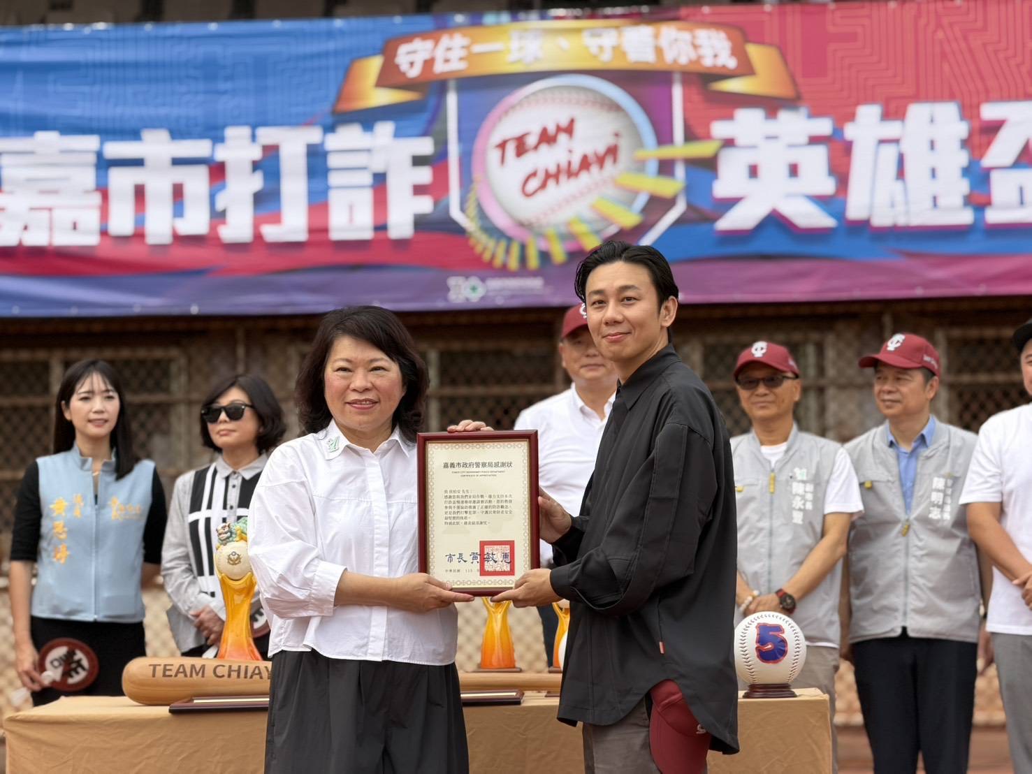 嘉義市政府跨局處防詐陣線正式成軍!嘉義市政府今(18)日一早於運三棒壘球場舉辦「嘉義市打詐盃慢速壘球邀請賽」,跨界集結嘉義市政府警察局、地政處,攜手嘉義市議會與嘉義郵局與富邦證券等防詐單位,5支勁旅同場比拼競技。黃敏惠市長為賽事開球,感謝公私部門攜手,透過指標性賽事整合公私部門,將防詐宣導轉化為全民運動,展現打擊詐欺的鐵腕決心。