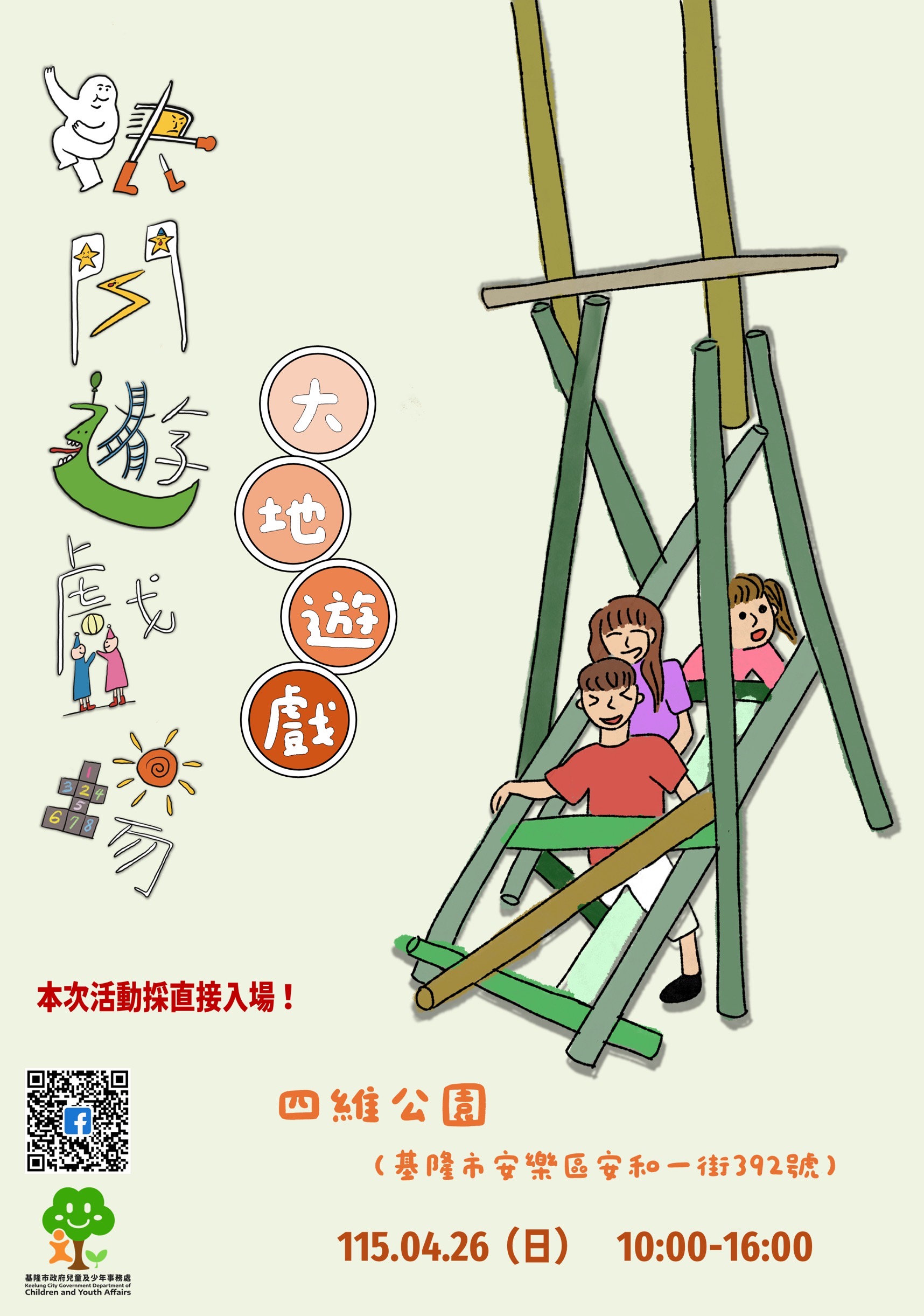 為落實《兒童權利公約》(CRC)保障兒童遊戲權,基隆市政府兒童及少年事務處規劃「山海基隆‧童心啟航-兒少大地遊戲」,將於4月26日在安樂區四維公園熱鬧登場,透過結合大自然與社區空間的設計,邀請全市親子家庭共同體驗回歸本質的遊戲樂趣。