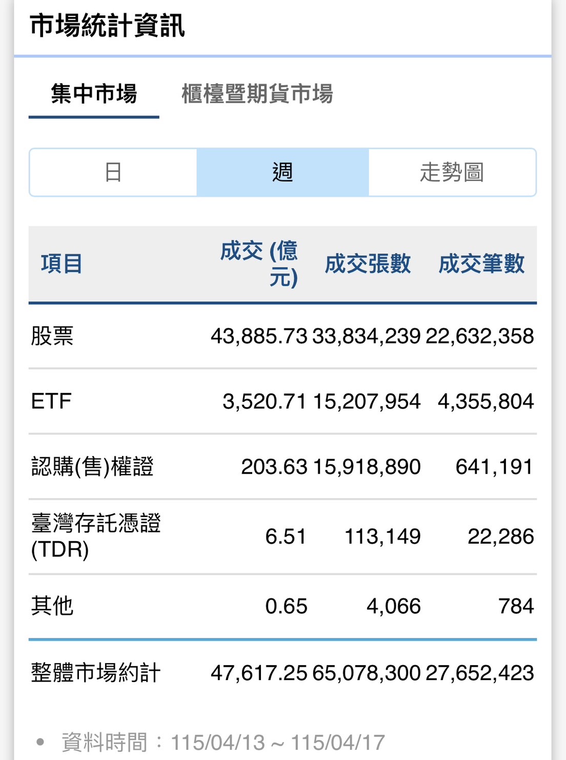 本週集中交易市場總成交金額為 4 兆 7,550.86 億元,全體上市股票成交金額為 4 兆 3,819.34 億元,股票成交量週轉率為 4.25%。