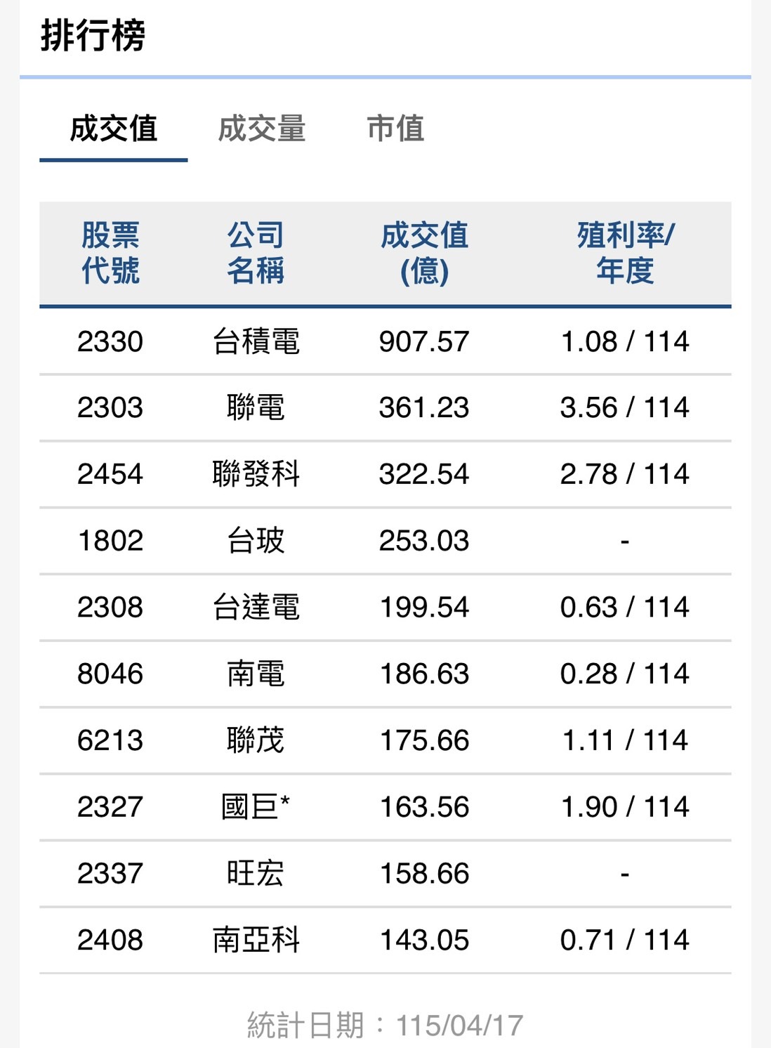 【記者張靜惠台北報導】台灣股票市場本週發行量加權股價指數漲幅約為3.91%,上市股票總市值達120.06 兆元,115 年 4 月 17 日全體上市公司市場總值為新台幣 120 兆 594.22 億元,較上週(115 年 4 月 10 日)市值 115 兆 5,589.94 億元增加 4 兆 5,004.28 億元,增幅約為 3.89%。