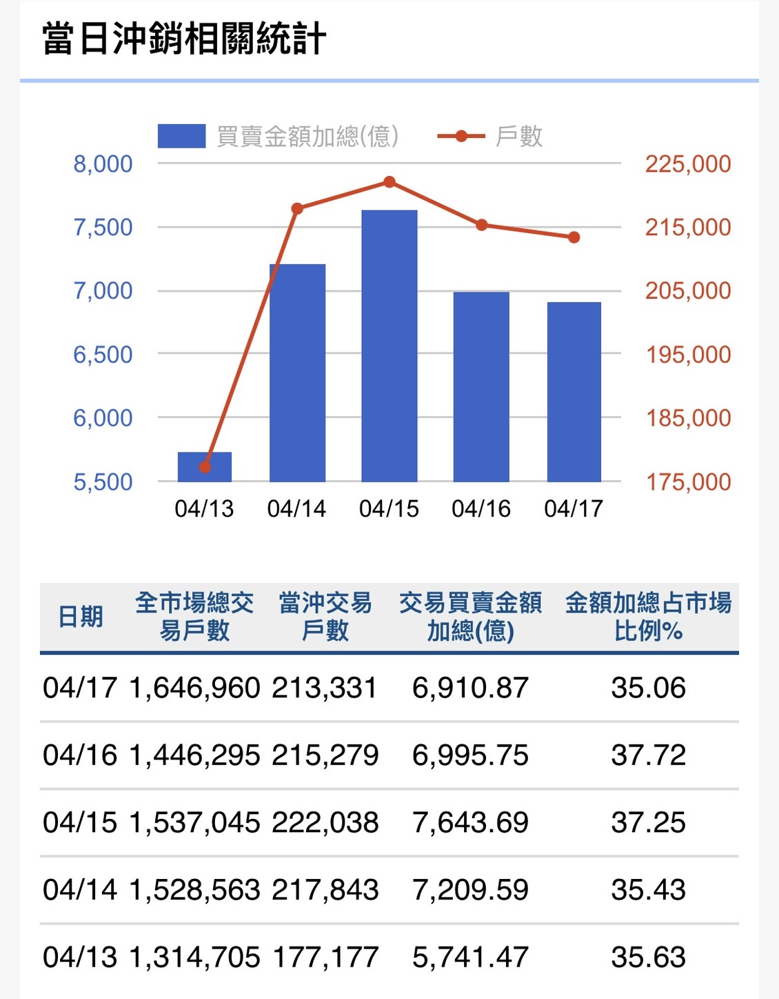 累計今年年初開盤迄今共 66 個交易日,集中市場總成交金額為 53 兆 7,202.86 億元,市場日平均成交金額為 8,139.44 億元,股票成交量週轉率為 54.97%,股票日平均成交量週轉率 為 0.83%。