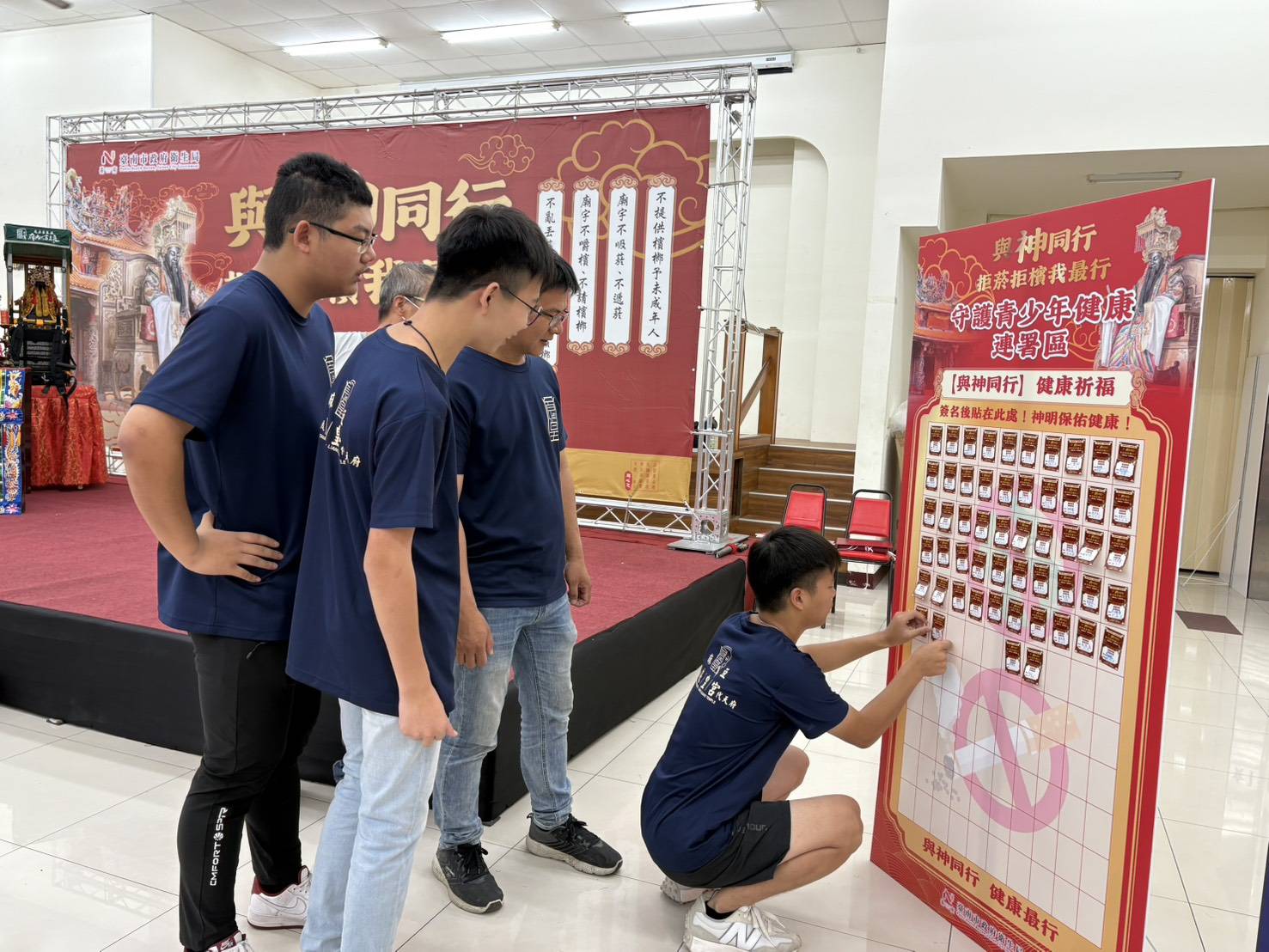 為守護青少年健康、遠離菸品與檳榔誘惑,臺南市政府衛生局今(18)日於麻豆草店尾良皇宮代天府舉辦「與神同行,拒菸檳我最行」宣誓活動。結合在地信仰,號召市民共同拒絕菸品與檳榔,守護自己與家人健康。今日衛生局黃文正副局長及麻豆區楊政舉區長親臨現場,在醫神「保生大帝」聖前,與市民共同立下健康誓約,傳遞「無菸無檳」的生活理念,場面熱絡。