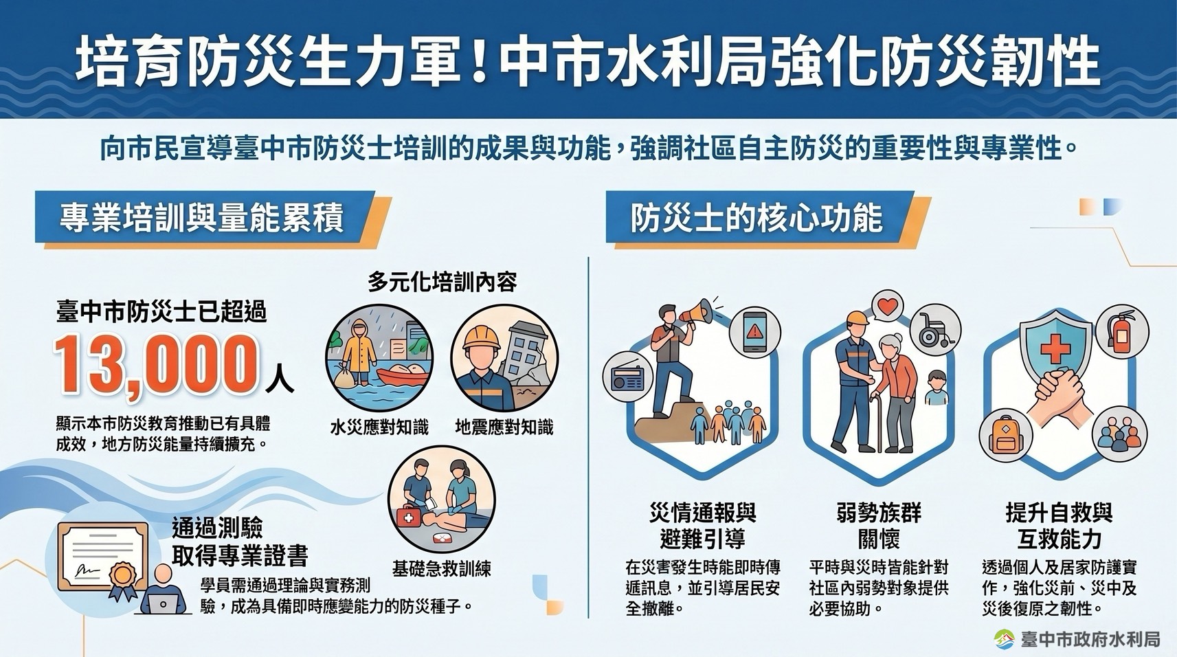 水利局指出,截至目前台中市防災士人數已逾1萬3,000人,顯示防災教育推動已具體累積成果。防災士除可提升個人自救與互救能力外,也能在社區中協助防災宣導、災情通報、避難引導及弱勢族群關懷,為強化地方防災韌性的重要基礎。