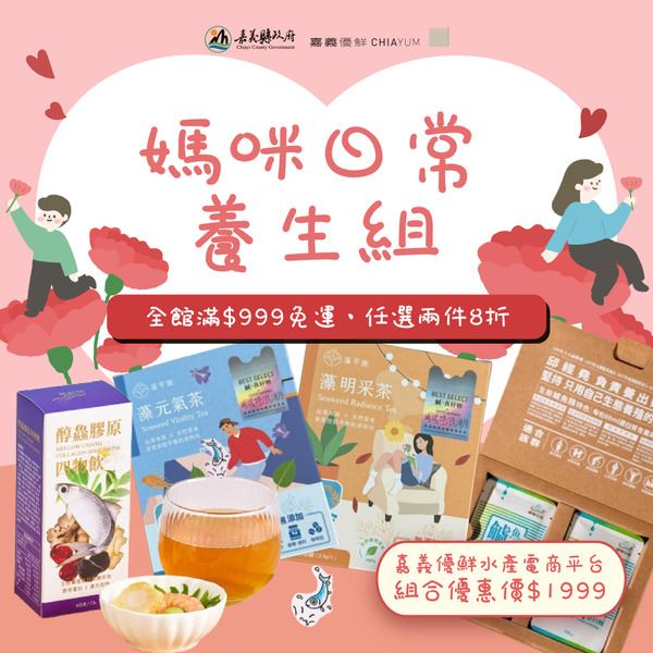 嘉義優鮮水產電商平台結合「嘉義優鮮」品牌與線上購物,集結20家認證業者,推出150項水產商品,讓在地優質水產以便捷新鮮的方式送到消費者手上,全館,母親節期間精選4款寵愛媽咪優惠組合,讓民眾得以快速選購,享受嘉義尚鮮的海味。