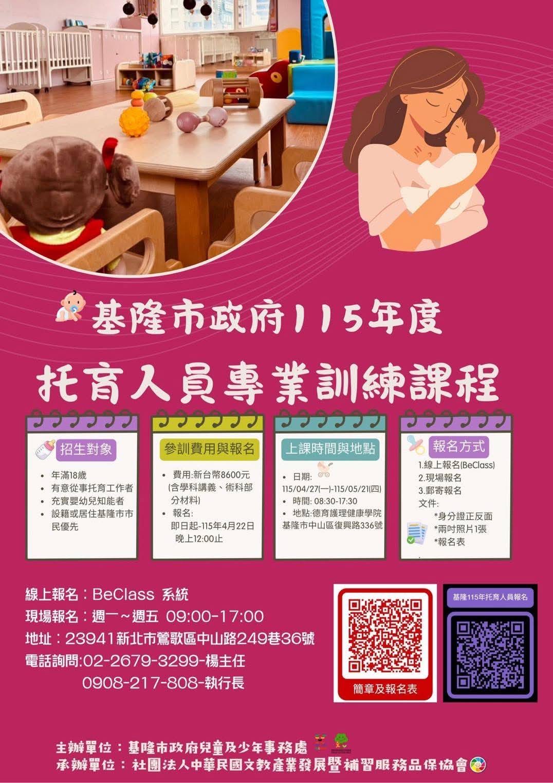 為提升基隆市托育服務品質,培養更多具備專業知能與實務能力的托育人員,基隆市政府兒童及少年事務處將於115年4月27日至5月21日,在德育護理健康學院辦理自費「托育人員訓練課程」。報名時間自即日起至4月26日中午12時止,民眾可選擇現場、郵寄或網路方式報名(報名連結:https://www.beclass.com/m/rid=305263d69dc97b11975e)。⁠