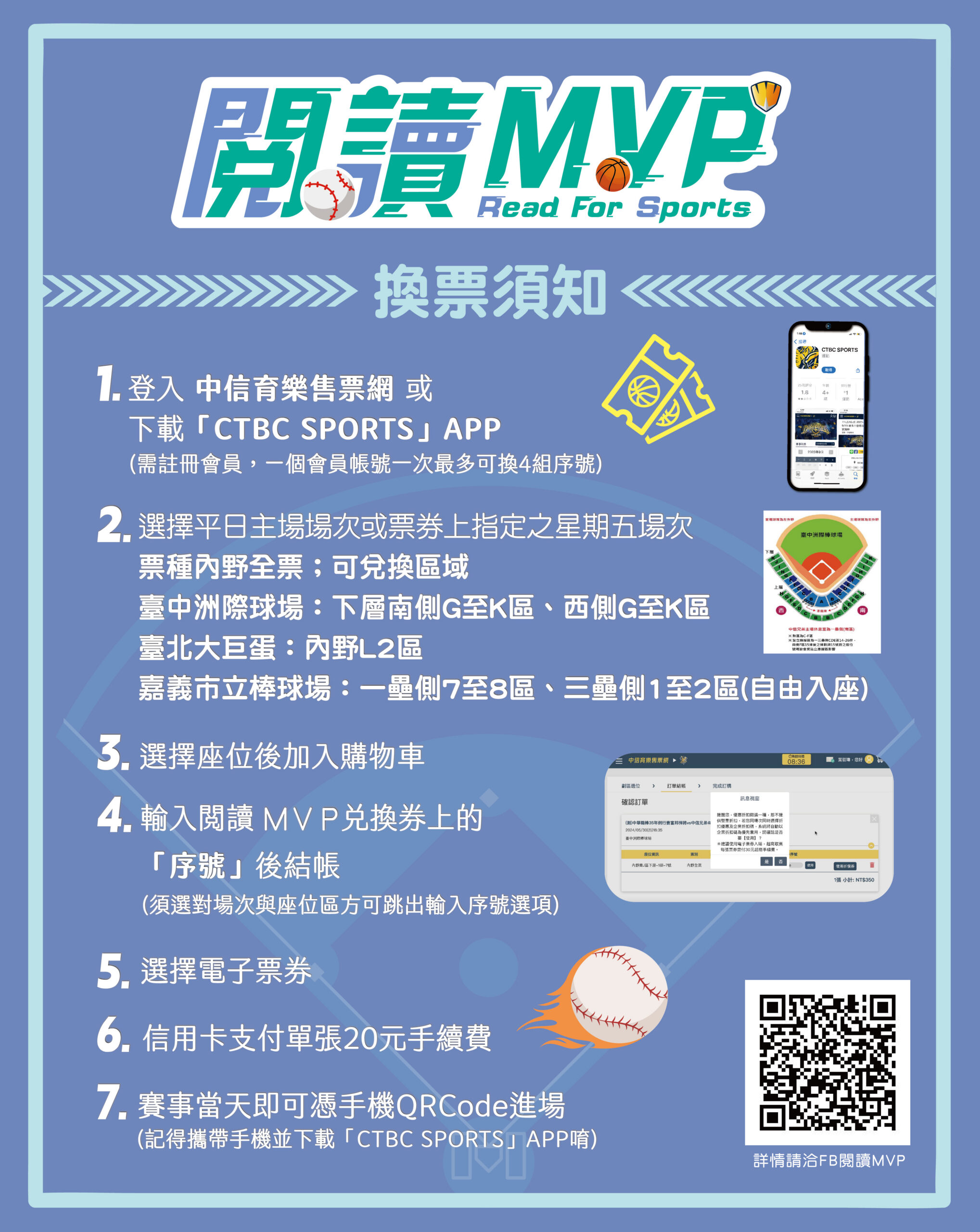 江局長進一步指出,「2026閱讀MVP」活動期間自4月21日起至5月17日止,市民朋友只要在本市公共圖書館借閱滿10本書,即可兌換1張中信兄弟主場門票兌換券。此外,今年特別加碼推出寫作抽獎活動,只要在館內索取專用稿紙撰寫300字以上的讀書心得並交回櫃檯,就有機會抽中漢來日月行館雙人一泊二食住宿券及多項職棒、職籃限量好禮,歡迎大家踴躍參與。