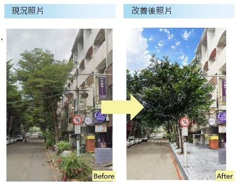 後續鋪面改善工程預計於5月15日進場,工期約2個月,將原有連鎖磚更新為混凝土壓花地坪,改善長度約400公尺、面積約1,600平方公尺,並同步整併既有設施、優化通行動線,打造安全、順暢且無障礙的人行空間。