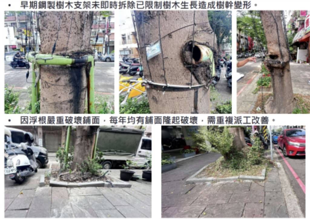 建設局長陳大田表示,大隆路(東興路三段至精誠路)為具代表性的綠蔭大道,承載在地生活記憶,但兩側人行道早期鋪設連鎖磚已顯老舊,加上行道樹小葉欖仁生長狀況不佳,浮根問題嚴重。經專業樹木健診發現,小葉欖仁屬淺根性樹種,且早期樹穴空間不足,導致樹木出現傾斜、中空腐朽等情形,甚至支撐鐵架嵌入樹幹,造成樹幹變形,影響結構穩定,存在倒伏風險,地方也多次反映改善需求。