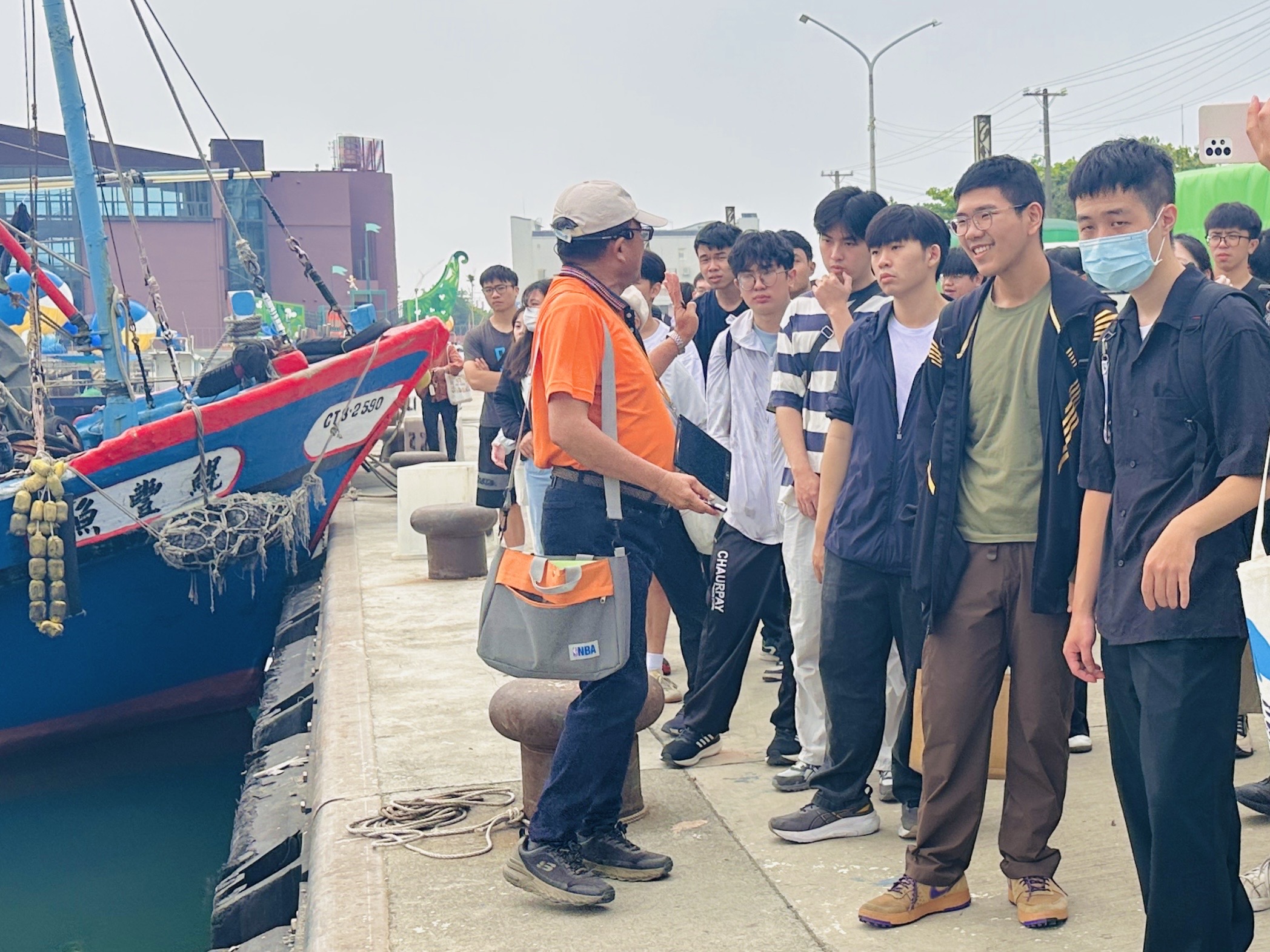 隨後由蚵仔寮文化協會進行專業導覽,帶領師生走訪蚵子寮漁港,認識漁業設施、作業型態、廟宇信仰及魚市場運作,透過實境解說將書本知識轉化為具體體驗,讓學生感受漁村生活與產業文化的連結;另於海洋教室2樓同步辦理「海洋生物與漁業文化DIY體驗課程」,共30人參與,透過創作立體漁船作品,理解水產品從捕撈到餐桌的歷程,深化對漁業文化的認識。